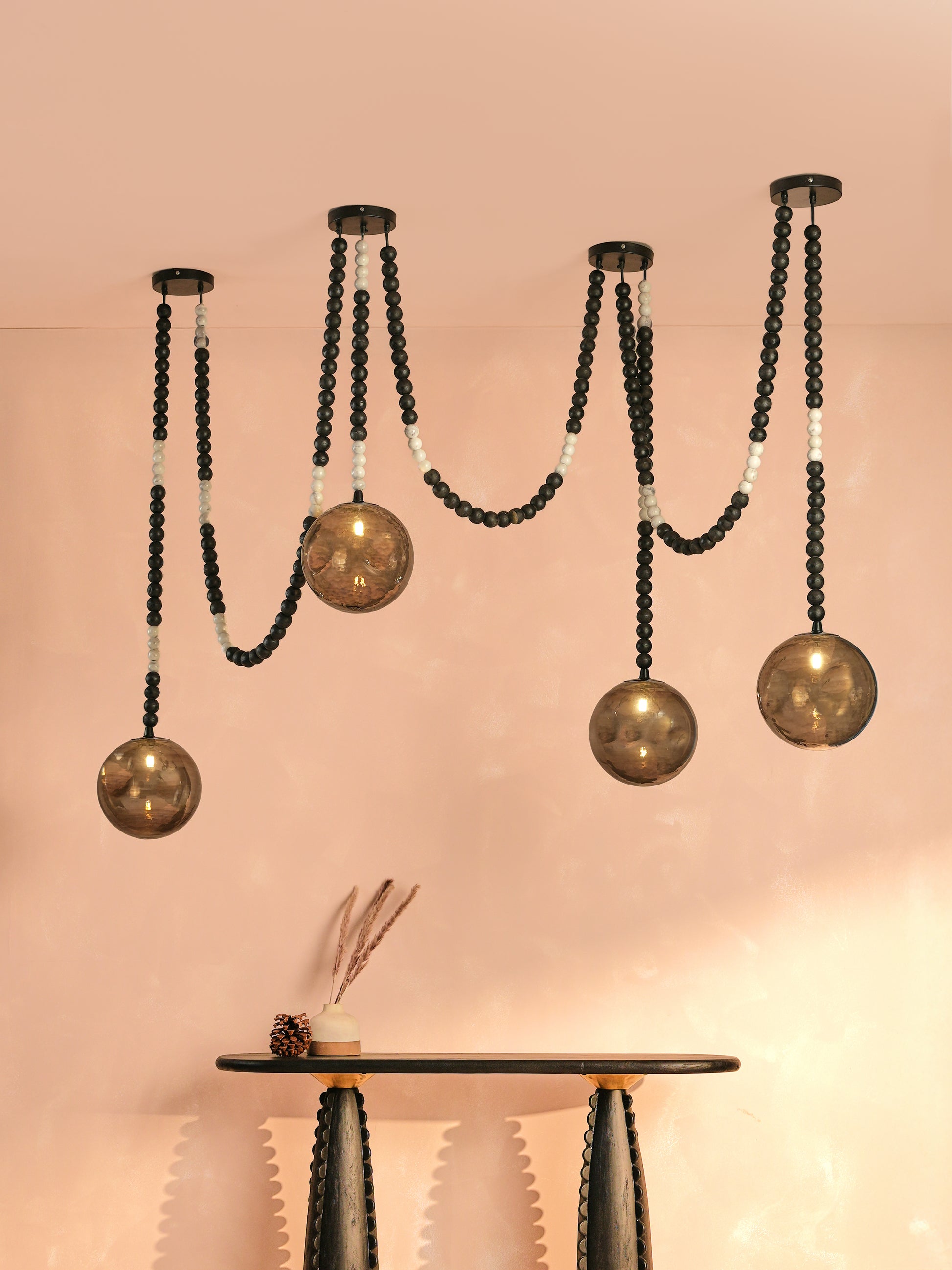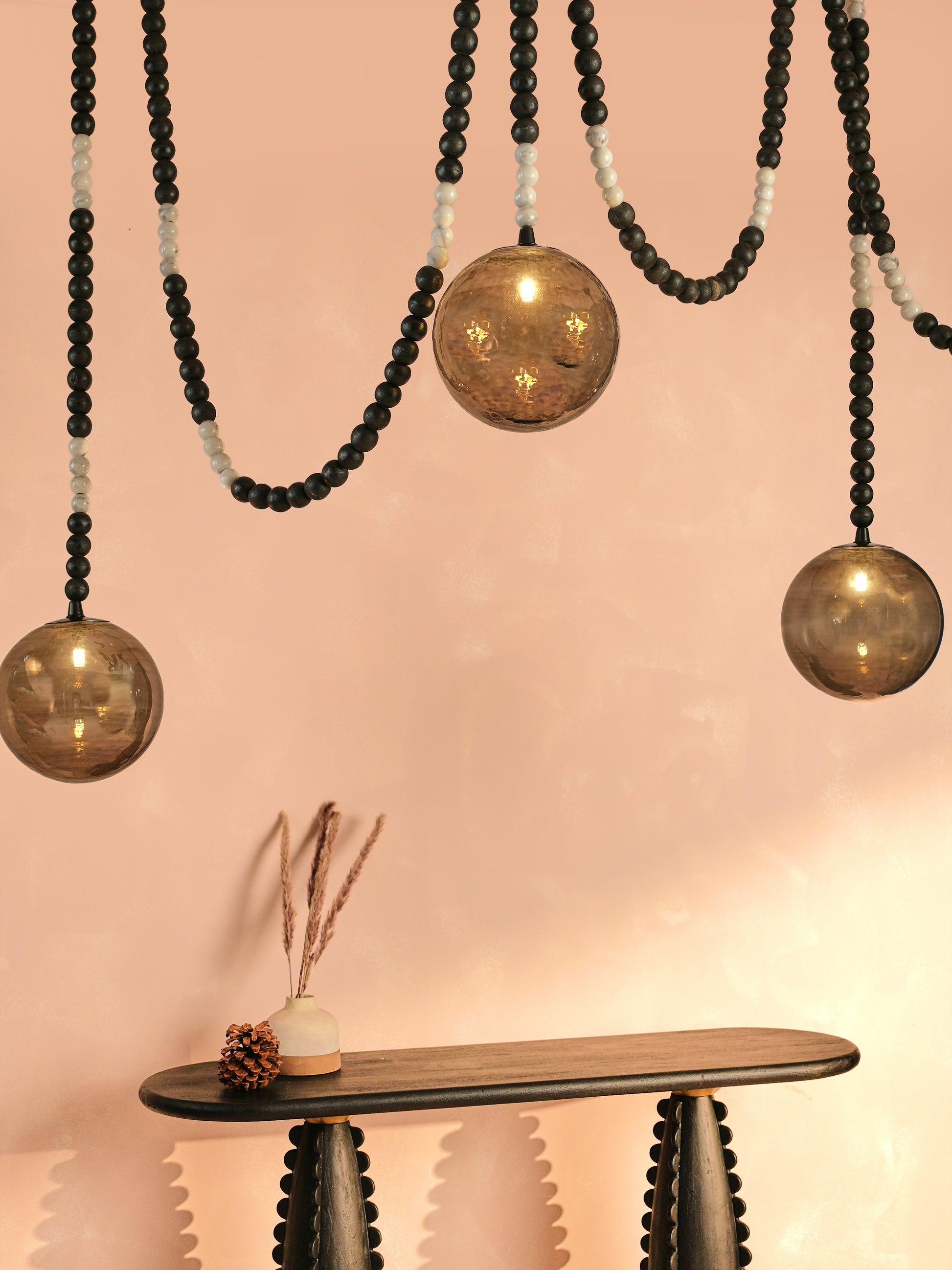 Carved from earth and sky, the Dhara Chandelier merges marble, wood, and glass. White marble beads cascade beside smoky glass, steadied by black-stained wood. It glows like fragments of twilight woven together. A chandelier both organic and celestial.