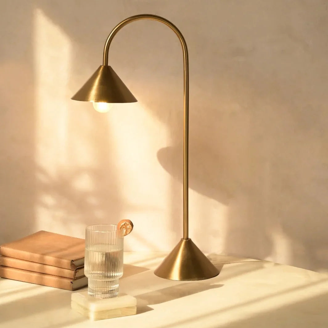 The Hush Table Lamp combines sleek metal and a golden finish to bring a warm, refined glow to any bedside or reading nook, elevating your space with effortless elegance.