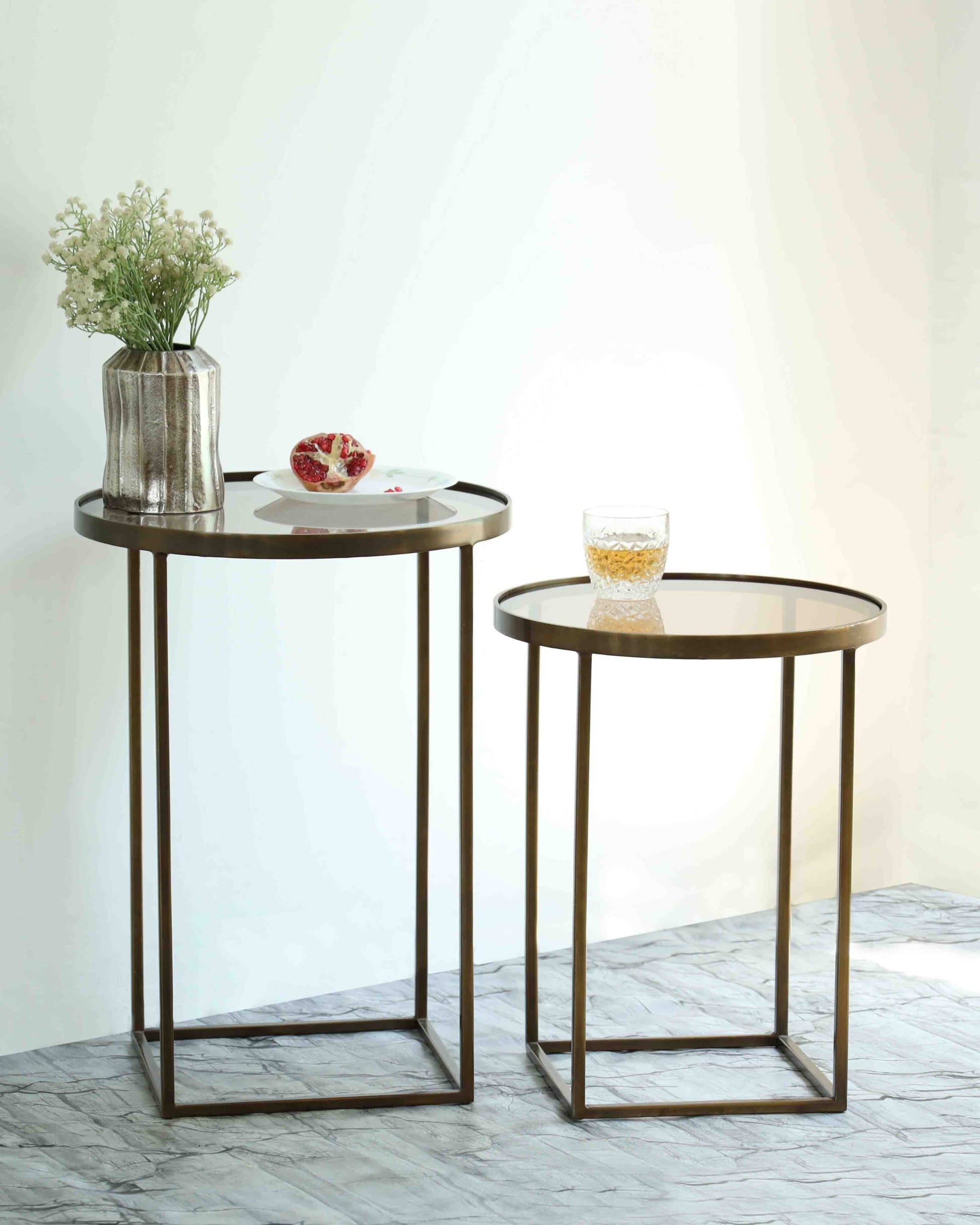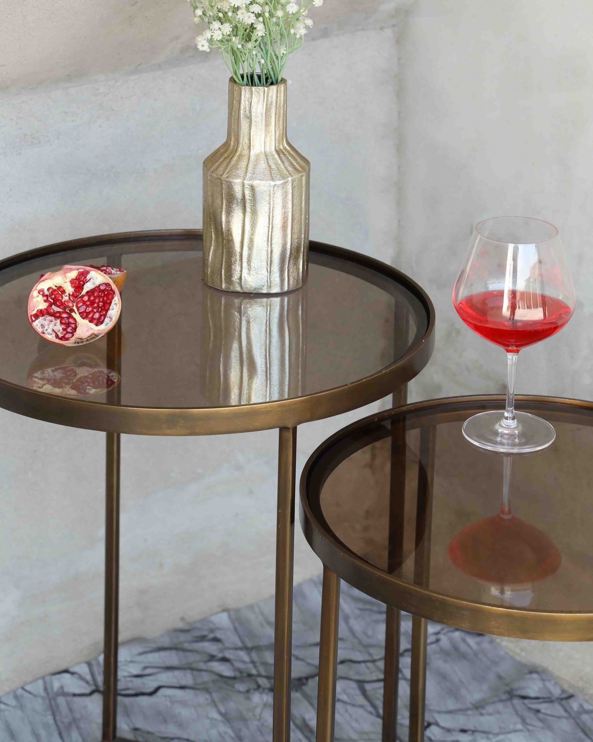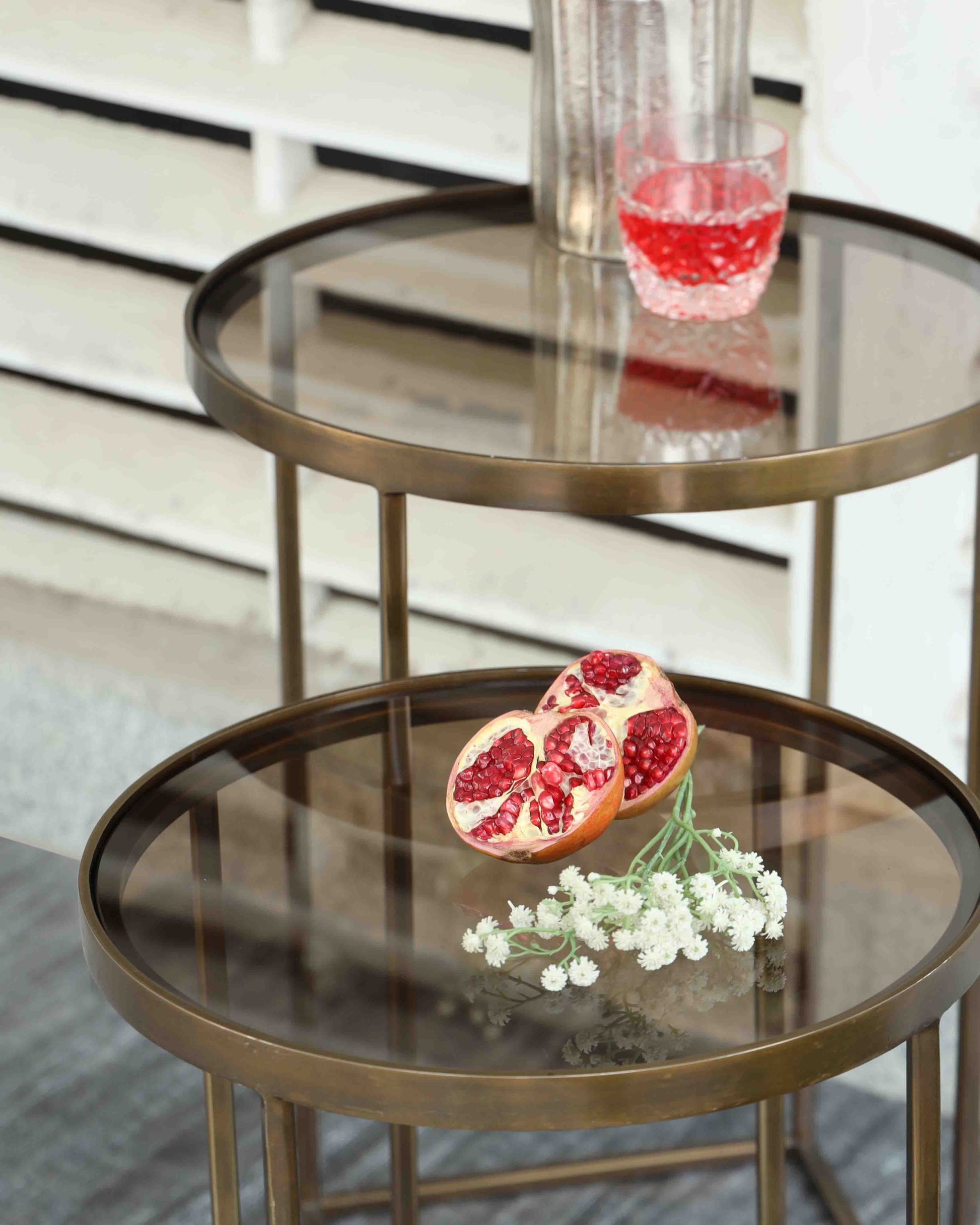 A sleek and versatile nesting table set featuring slim metal frames with a warm antique finish and reflective glass tops. Perfect for compact spaces, these tables nest neatly together or can be styled separately to add a modern, elegant touch to any living room or bedroom.