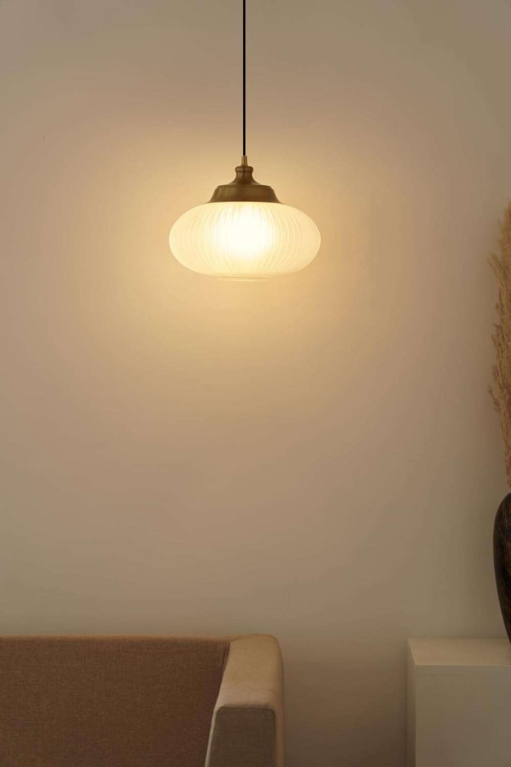 Ribbed Green Melon Glass Hanging Pendant Light Antique Brass Finish for Living Room, Bedroom, Home Decoration and Kitchen