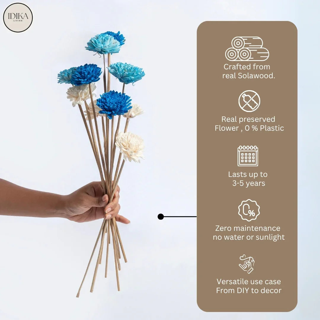 Add a touch of calm, cool elegance to your décor with our handcrafted Ziniya Sola Wood Flowers. This set of 10 flowers (6 cm each) comes in a refreshing blend of dark blue, sky blue, and white, creating a soothing yet striking colour palette that stands out beautifully in any space. Crafted using natural shola wood, these flowers are lightweight, eco-friendly, and intricately detailed—perfect for décor lovers who admire subtle luxury with an artistic twist.