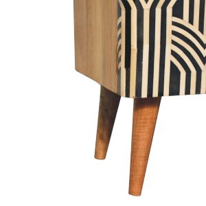 This beautiful boho-inspired media unit has been constructed from 100% solid mango wood and has a fine oak-ish finish. Other features include 2 open slots and 2 bone inlay front cabinets as well as Nordic-style legs. The bone inlay is sourced responsibly from deceased animals such as camels, goats, and buffaloes.