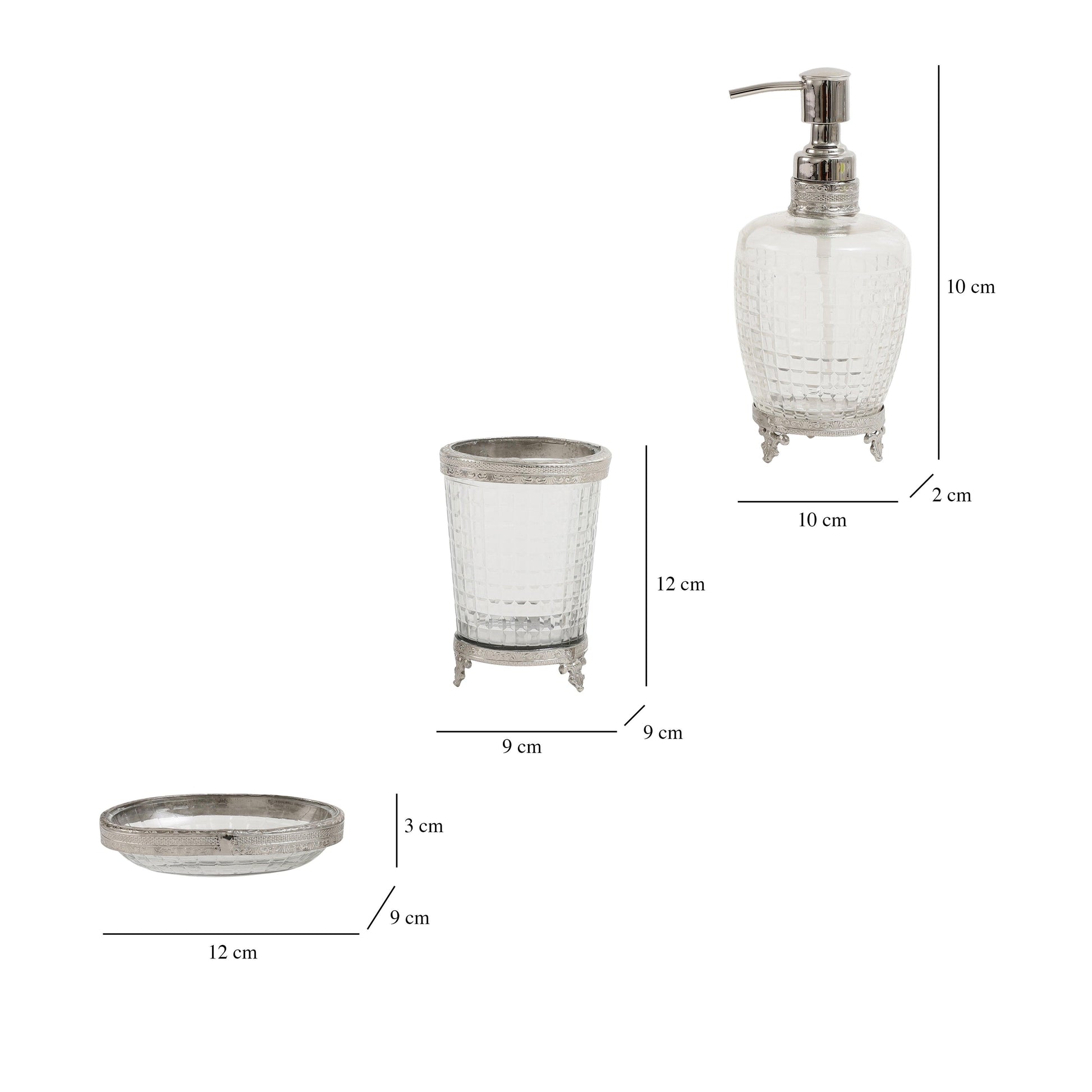 Add a touch of elegance to your bathroom with the Alvario Crystal Cut bathroom set in silver. This set includes all the essentials for your bathroom, from a soap dispenser to a toothbrush holder, all adorned with sparkling crystal cut accents that will elevate the look of your space. Made with high-quality materials, this set is not only stylish but also durable, making it a perfect addition to any modern bathroom. Upgrade your bathroom decor with the Alvario Crystal Cut bathroom set in silver today.