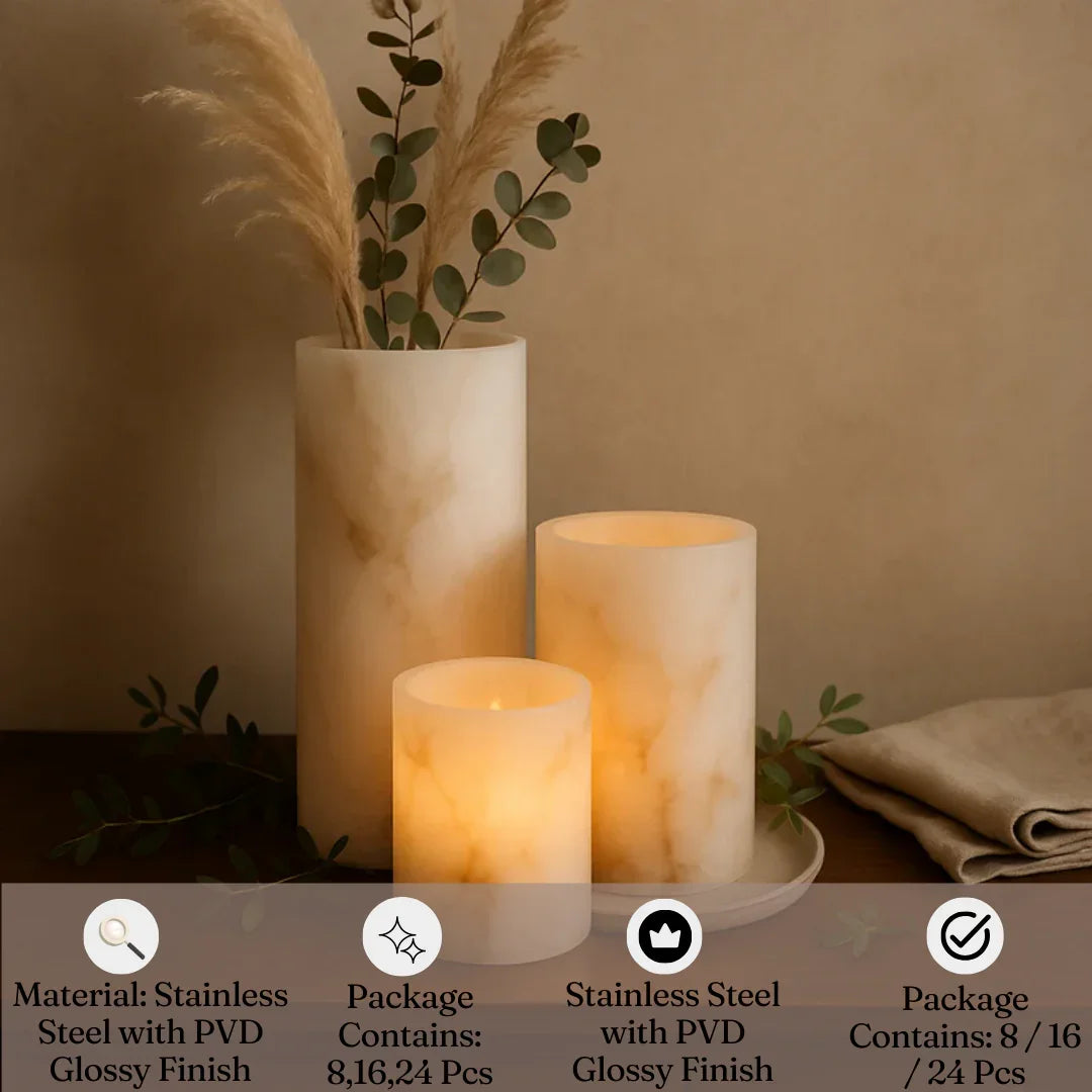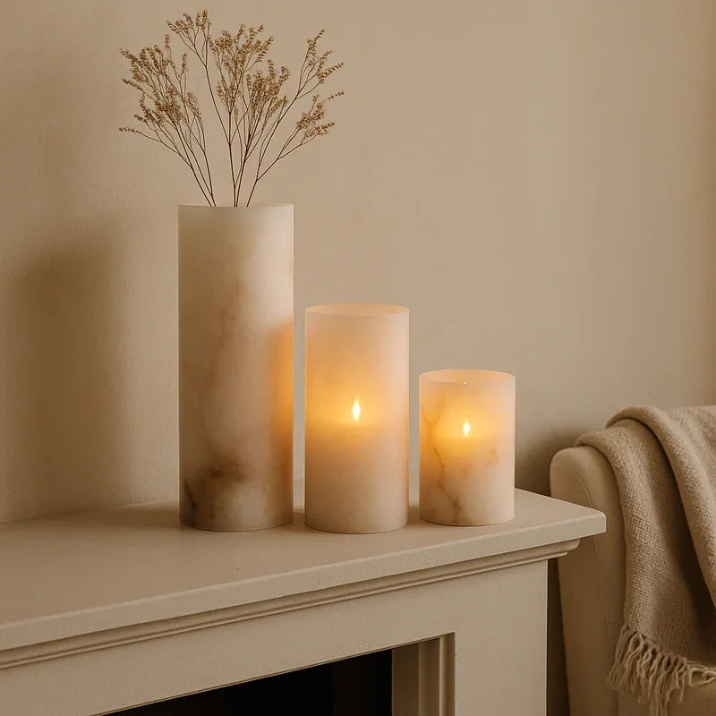 A versatile and sophisticated Three Alabaster marble tower is an addition to elevate the aesthetic of your spaces. These stunning pieces can be used in various ways to enhance the ambiance of your home, bedroom, living room, or office. Crafted from high-quality marble, each tower exudes elegance and timeless charm. The set's design allows for diverse functionality, making it a versatile accessory that complements different decor styles. Please note: These are handcrafted products, so minor design and color variations may occur. Additionally, the images and actual items may marginally differ due to photographic effects.