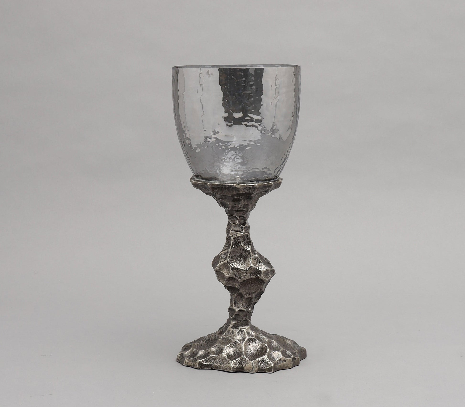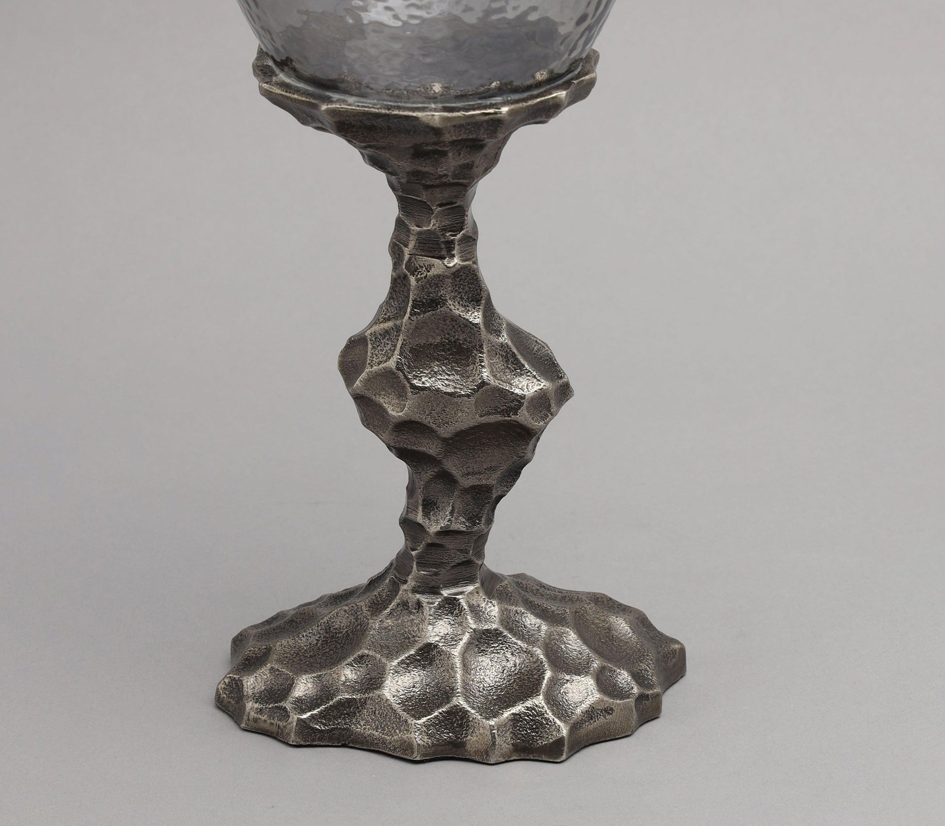 A stunning way to light up beautiful evenings, this chiselled candle holder is exquisitely crafted of antique nickel plated aluminium with textured black luster glass. A shimmery and sophisticated addition to your dinner table at the next soiree.