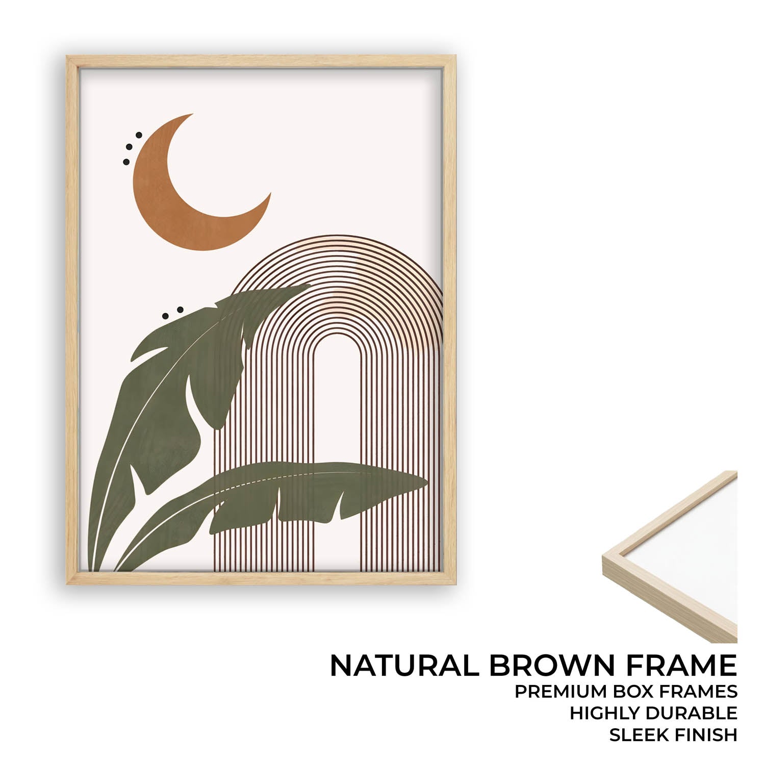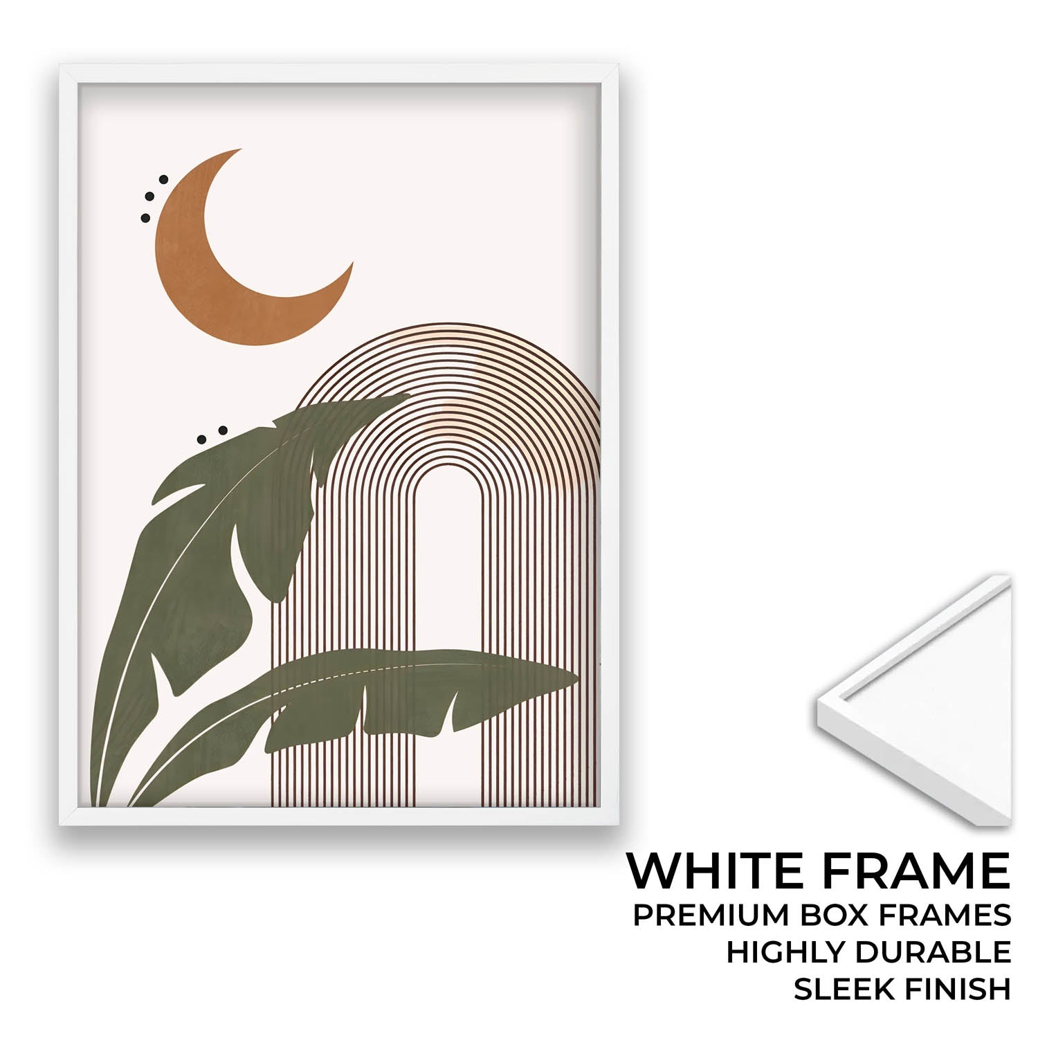 Moonlit Tropics blends arch geometry with wild banana leaves under a rising crescent moon. This abstract print brings earthy tones and soft mystery to modern and boho-inspired spaces.