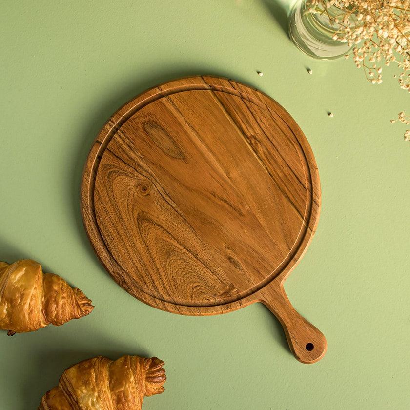 This is an ideal wooden board for serving Pizzas or using it as a Chopping board. It will look fabulous in the center of your table. It has built in groove which collects excess juices from chopped fruits and vegetables. The edges of this platter has been perfectly chamfered which makes it safe while using and looks modern at the same time.