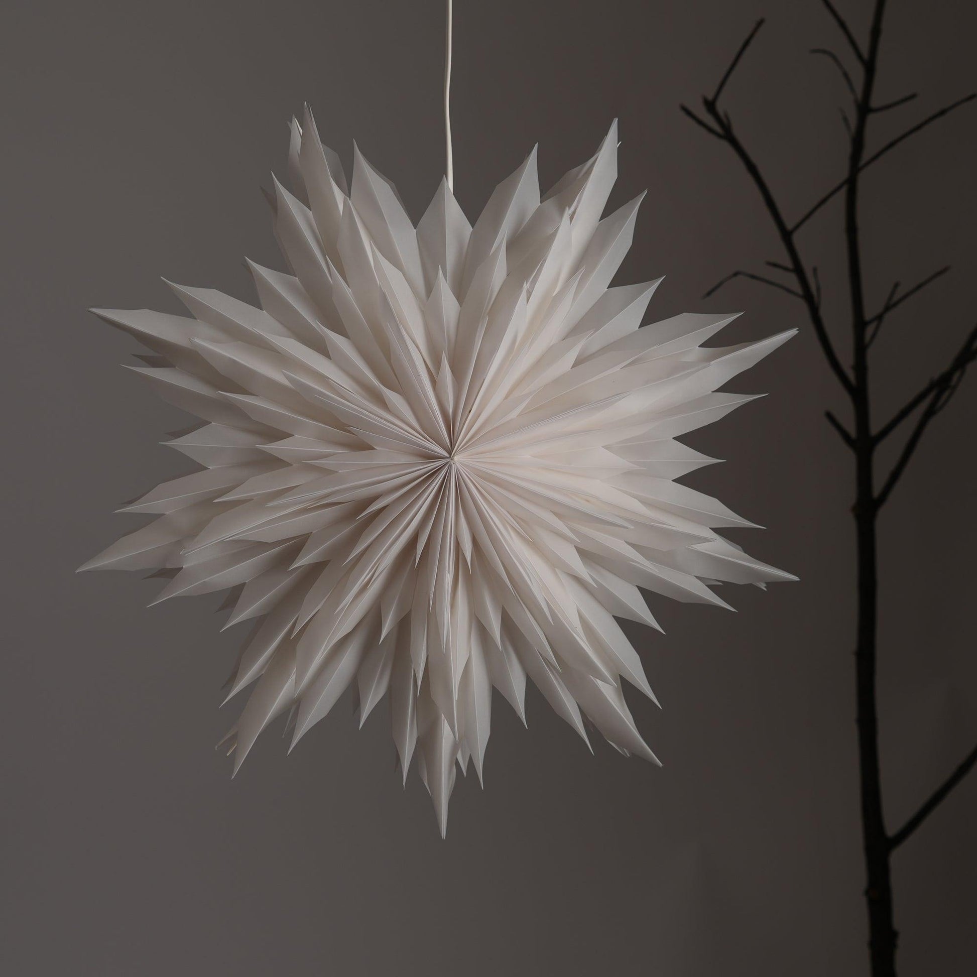 This stunning star-shaped festive light is crafted from a special paper designed to softly diffuse light, creating a warm, ambient glow. The intricate design allows the light to pass through the delicate layers, producing a serene and inviting atmosphere perfect for enhancing any room's mood. Its lightweight material and unique shape make it both an artistic and functional centerpiece, ideal for creating a calm, cozy environment in your living space.