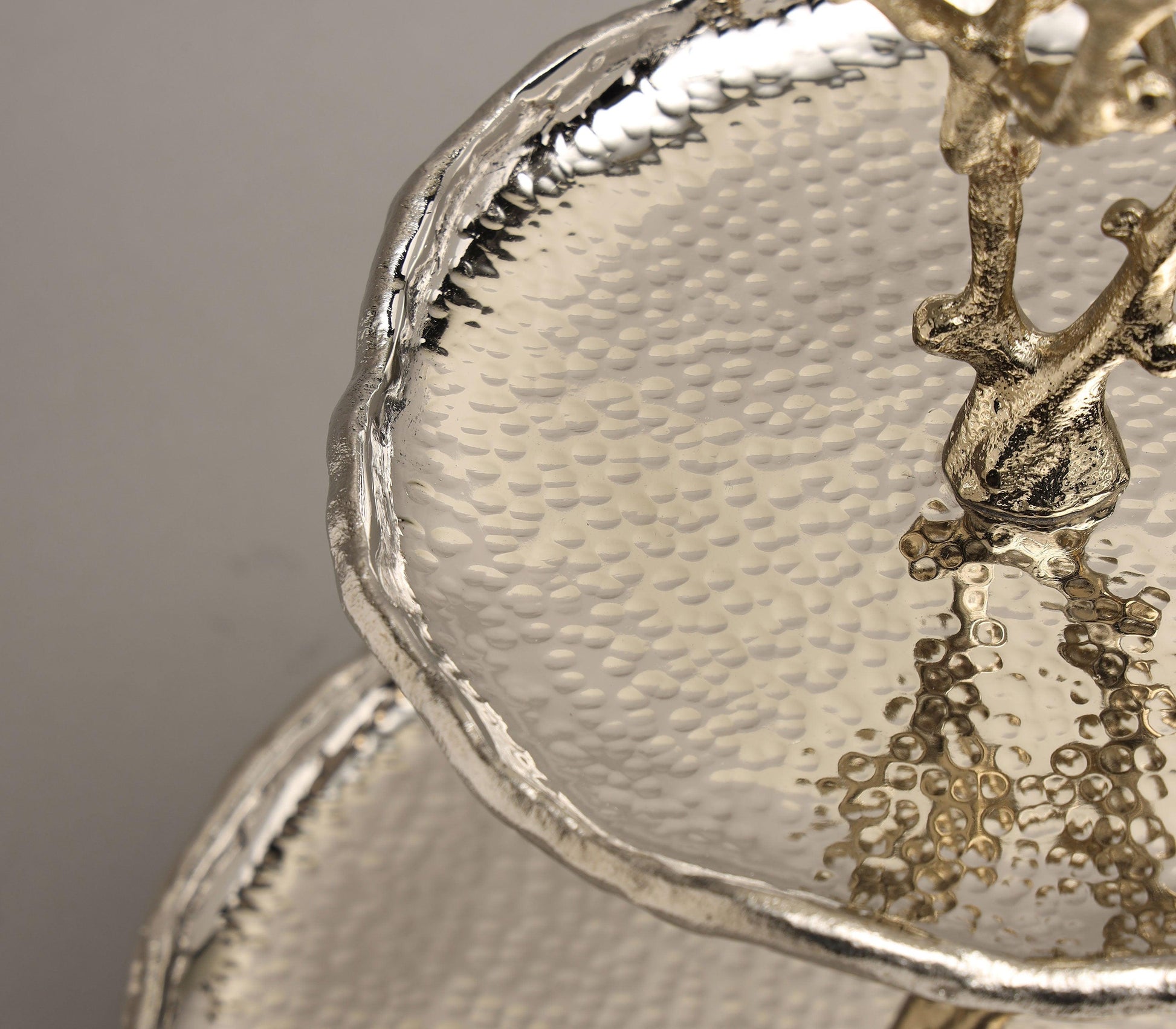 Inspired by a magical nook in a mystical forest, the fronds of the forest 2 tiered cake holder is as captivating as it is unique. The ornate texture of hammered aluminum with a gold finish and nickel plating is a splendid piece to add to your collection. The pillar of gorgeous and intricate branches tie the entire piece together. Don't pass up the opportunity to bring life to any soirée.