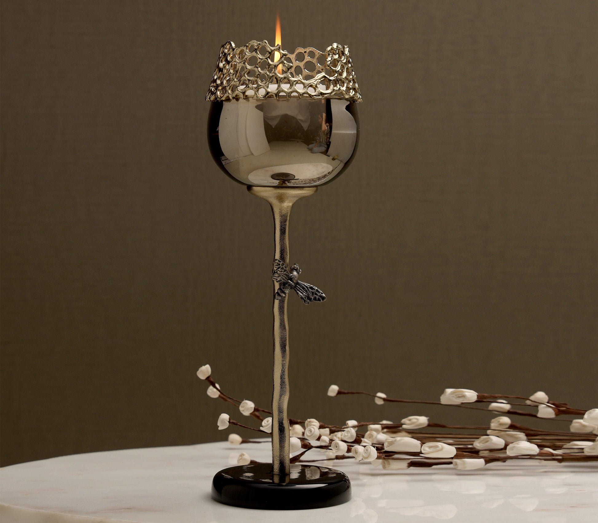 Your guests will be absolutely buzzing about this bee bobeche candle holder. The remarkably wonderful candle holder brings a sense of intrigue to any area in your home. Decorate your bathroom with them to add a touch of serenity the next time you soak in a relaxing bath, or you could grace any table with their unique style. The holders are crafted from glossy black powder coated aluminium and dark luster glass, while the stand is fabricated with gold finished aluminum and brass with antique nickel plated bee.
