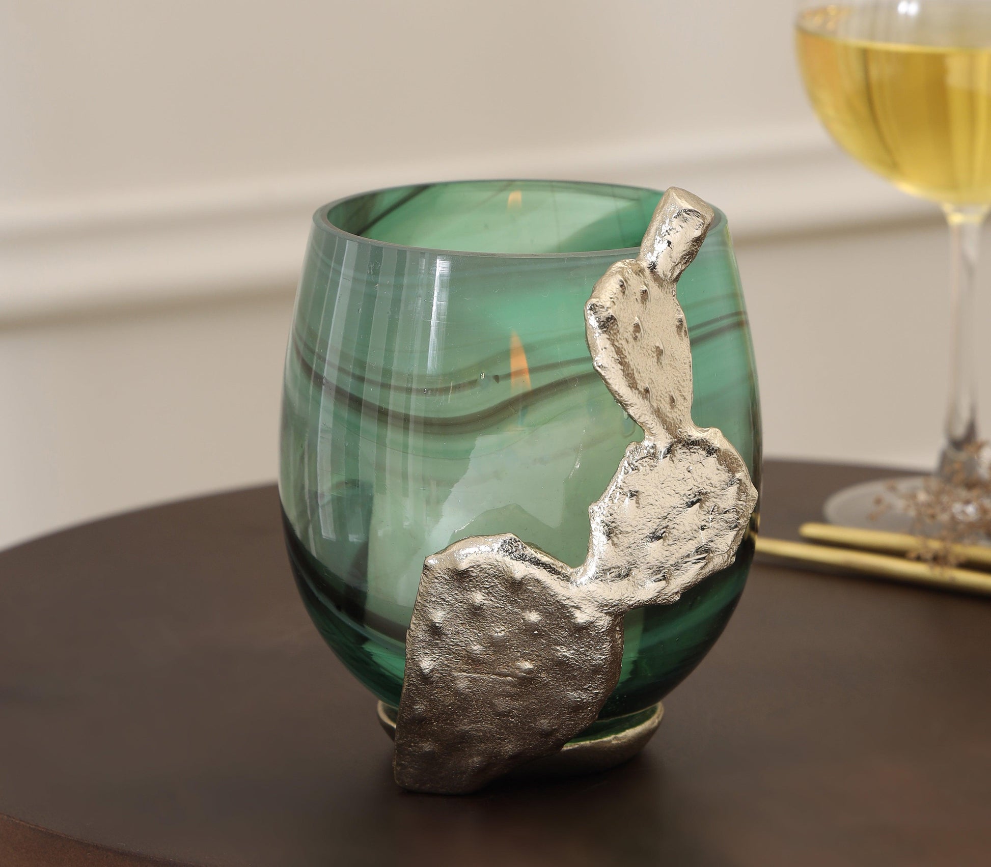 If soft, flickering lighting is what you're going for, then nothing quite illuminates a space like our cacti votive holder. Crafted with care using green onyx glass and wrapped in gold finished aluminum, this piece is perfect for a relaxing bath or even setting the table at an intimate outdoor grill with your loved ones, bringing the seductive energy of a desert with it.