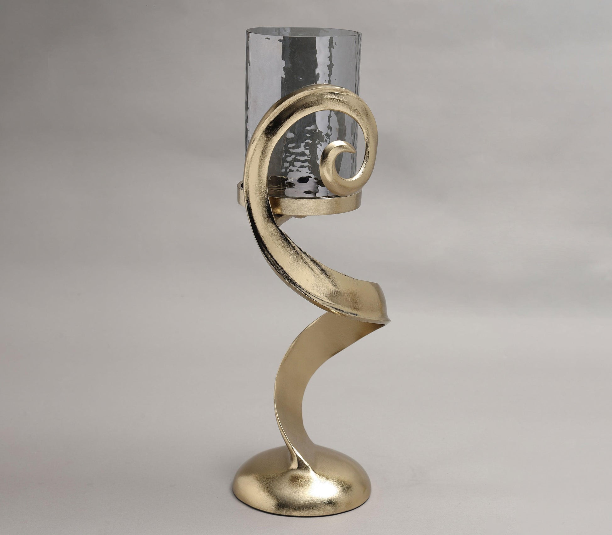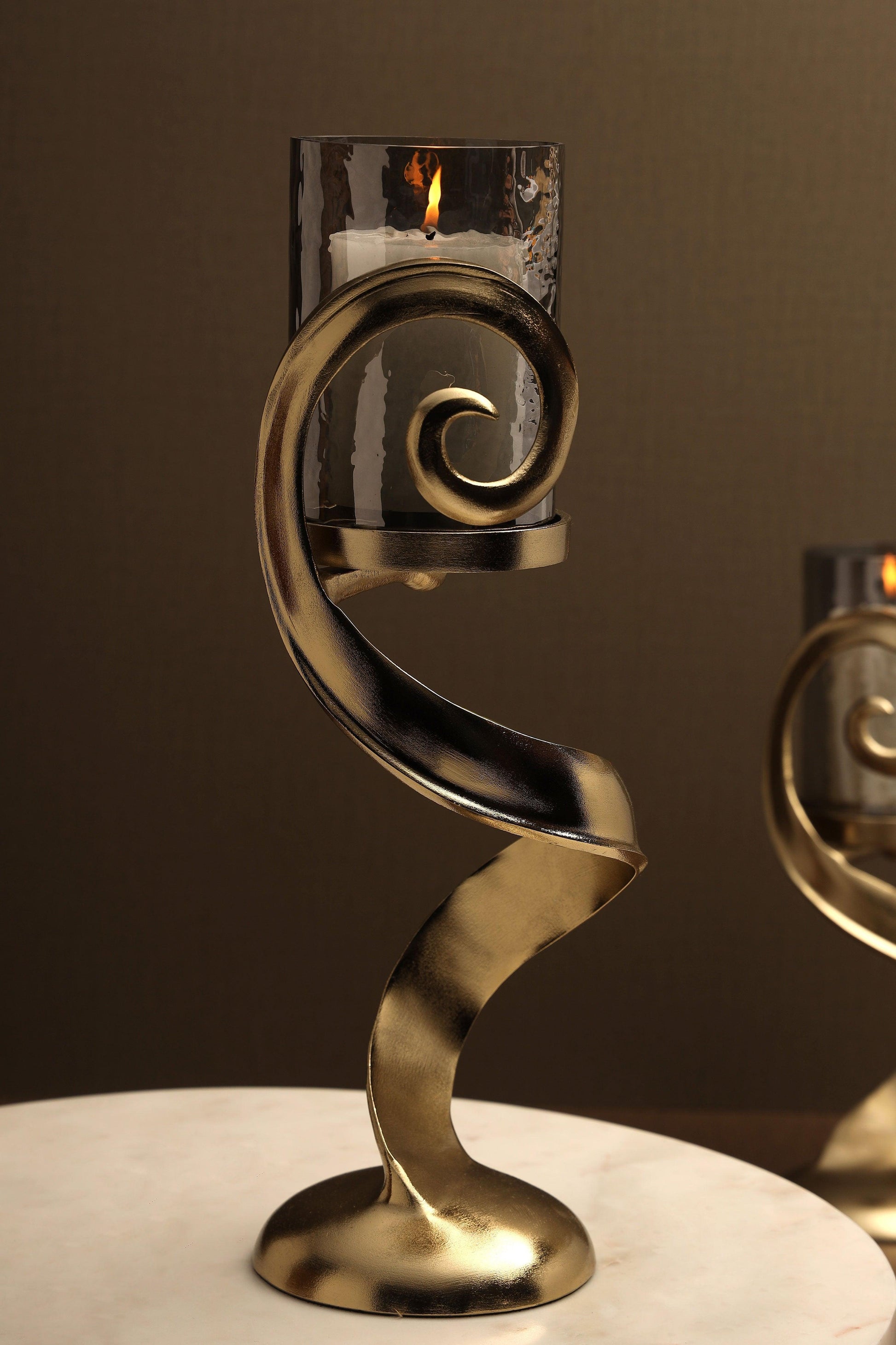 The petrichor pillar candle holder makes for a fluid and interesting style statement in your home. Like most abstract art inspired by great artists and nature alike, the petrichor pillar candle holder makes a statement but also blends in with your favorite furnishings and overal design concept. Forged in dazzling gold finished aluminium with textured black luster glass, the candle holder is a prerequisite for every unique home.