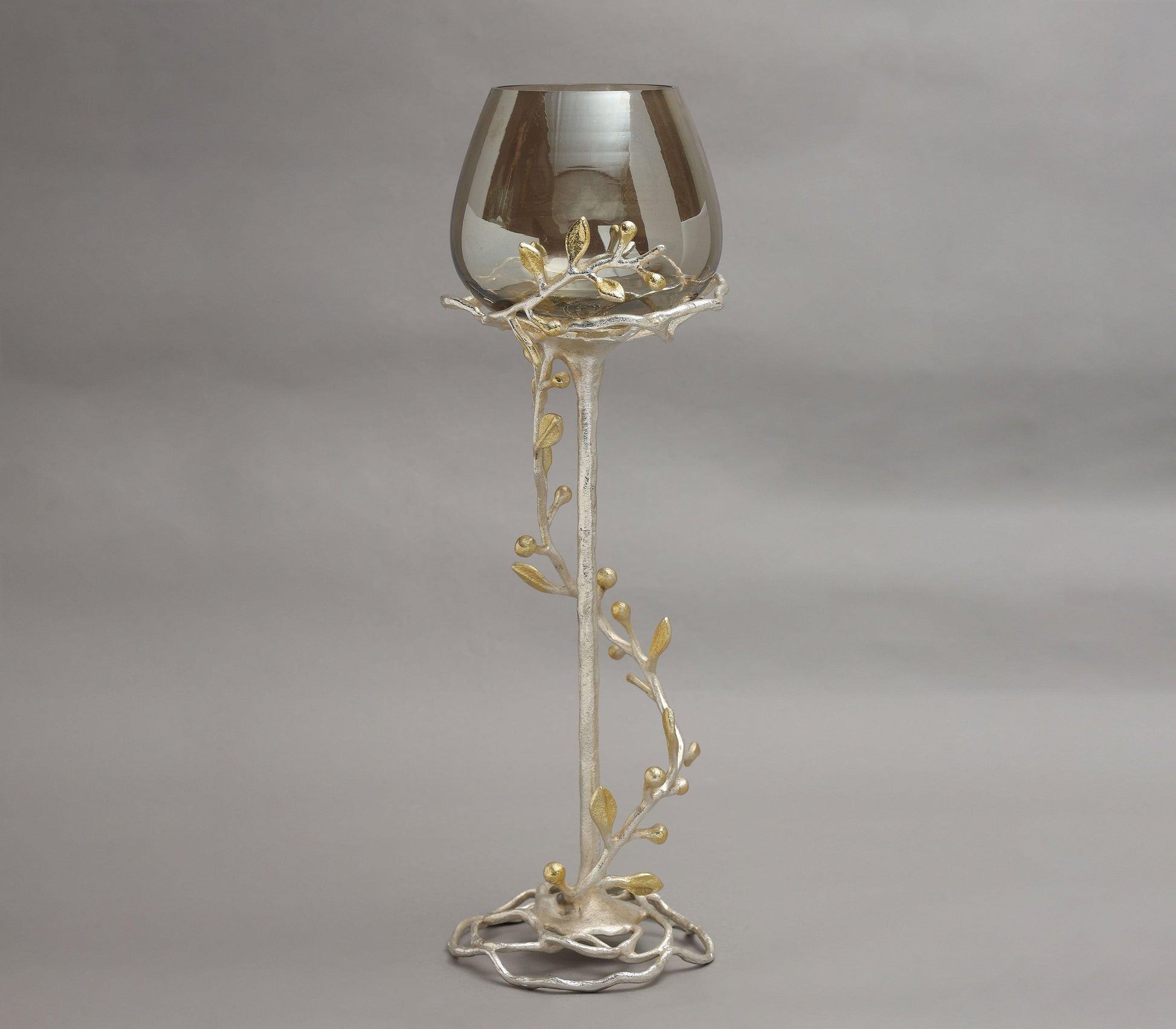 Inspired by the sweet aroma of berries in the wild, the scintilla candle holder is a unique addition to your home. Made with smoke luster glass for a vintage feel and nickel plated aluminium in a beaming gold finish, group several for a glamourous display or place one alone to take center stage on an accent table.