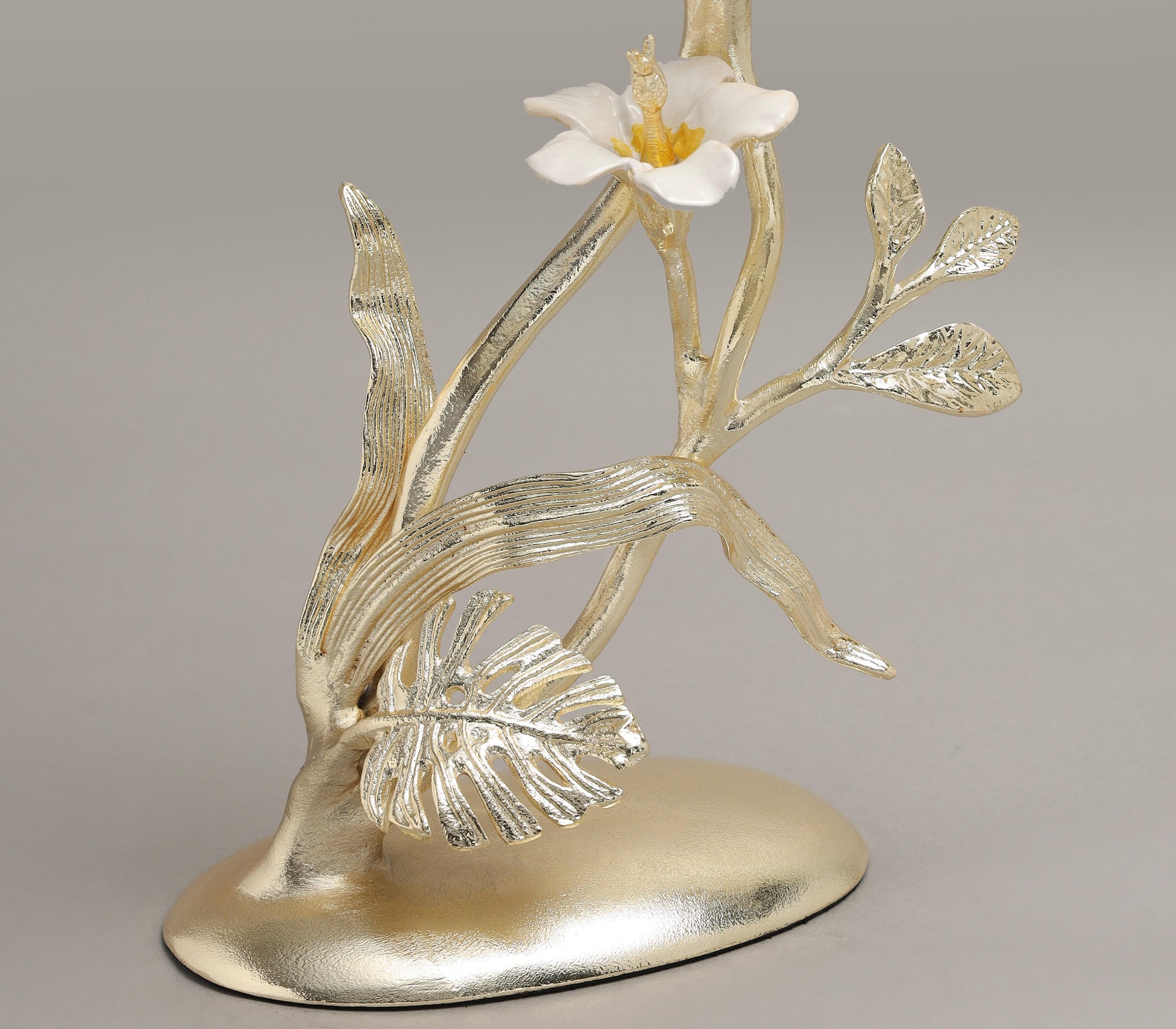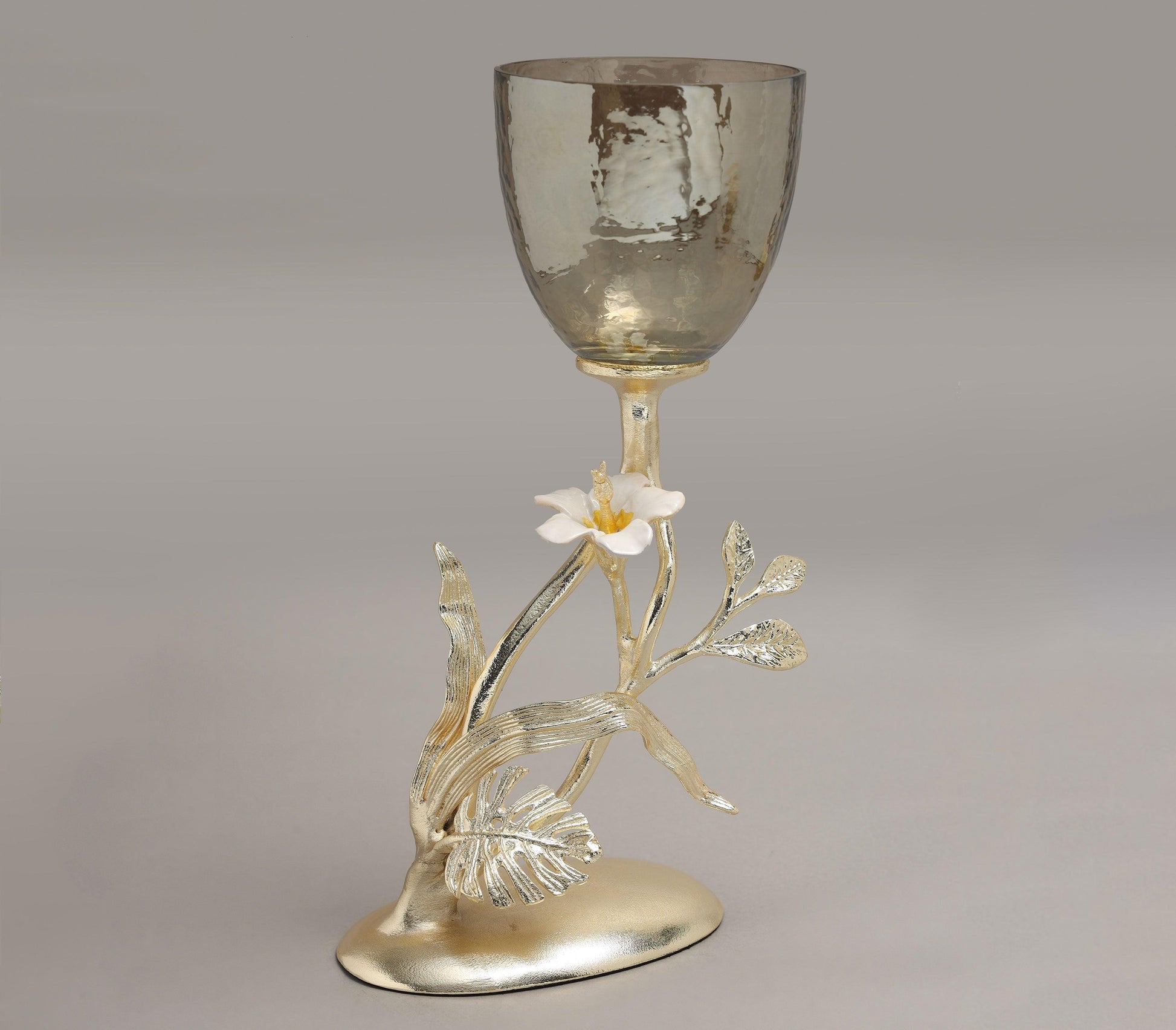 Bring lush tropical vibes straight into your home with our tropical candle holder. The blooming flower and monstera leaf is representative of tropical islands and transports us back to breezy tropical atmosphere. Hand casted with textured smoke luster glass & gold finished enamelled aluminium, it makes for the perfect balance between tropical and rustic modern.