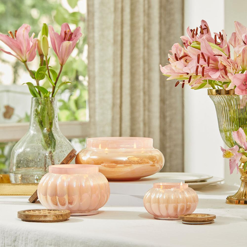 Introducing our Lustre Glass Candle with a wooden cane lid, adorned in soft pastel pink color, and infused with the captivating Water Lilly luxury fragrance.