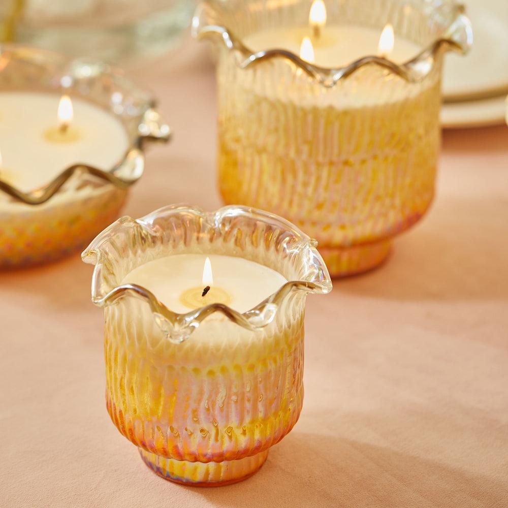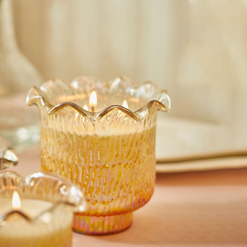Crafted in a rich amber-colored cylinder, this candle showcases a unique melted-mouth glass top that beautifully resembles a blooming flower, adding a touch of artisanal elegance to any setting.