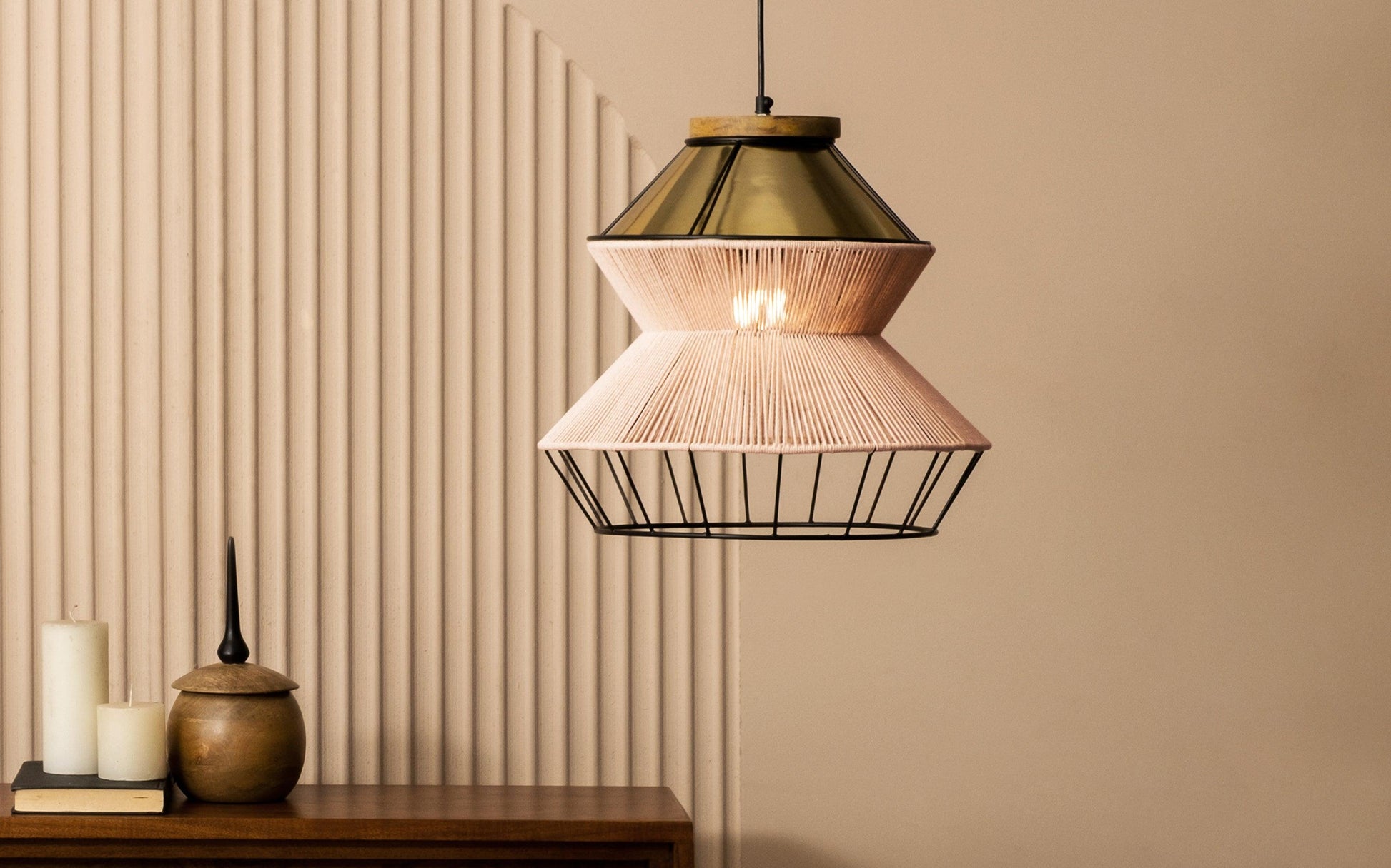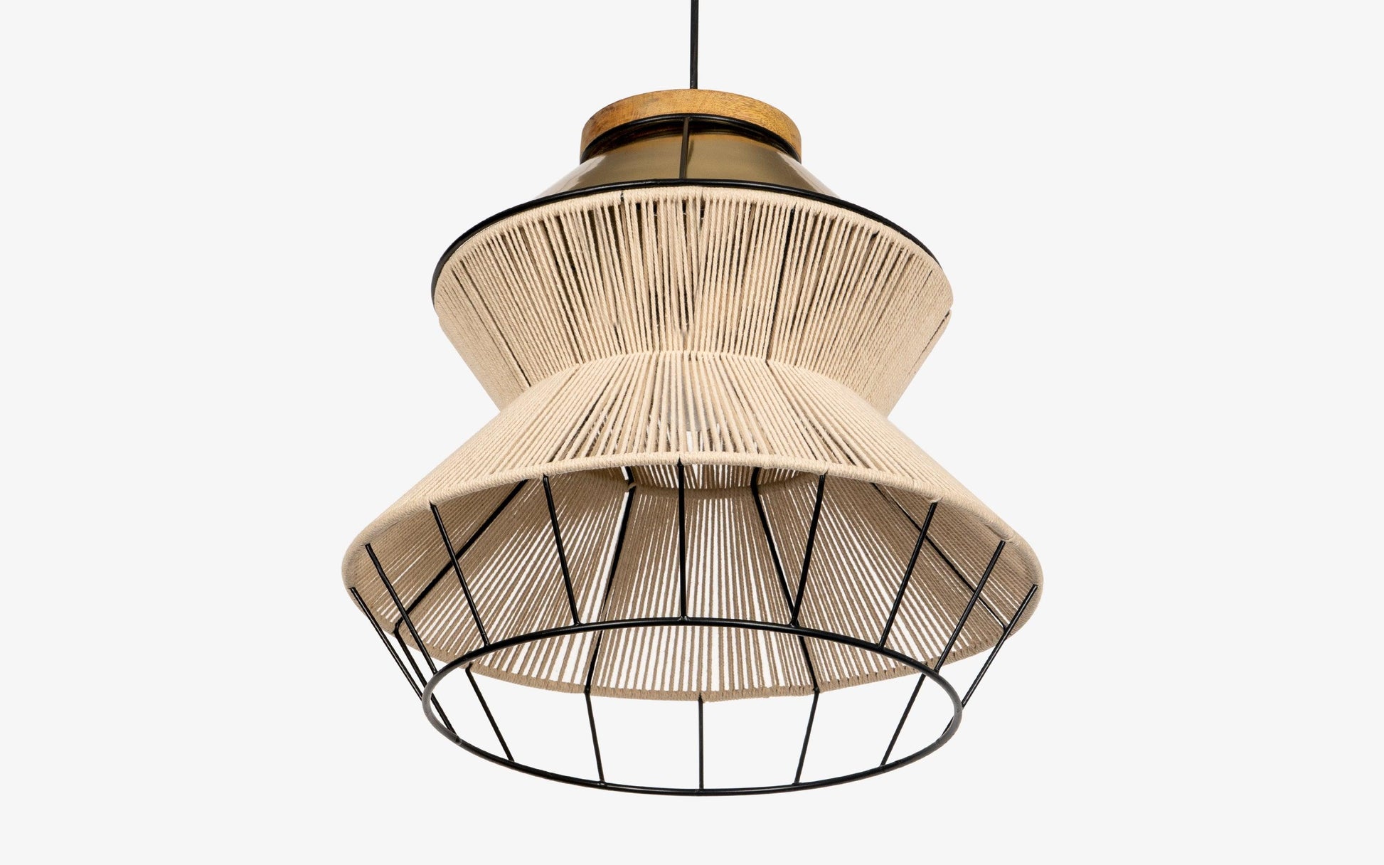 Elevate your living space with a touch of bohemian charm with our Waldo hanging light. Crafted with precision and a love for texture, this unique lighting fixture is a celebration of the natural and industrial world, seamlessly blending mild steel, mango wood, and peach cotton thread into a stunning visual masterpiece.