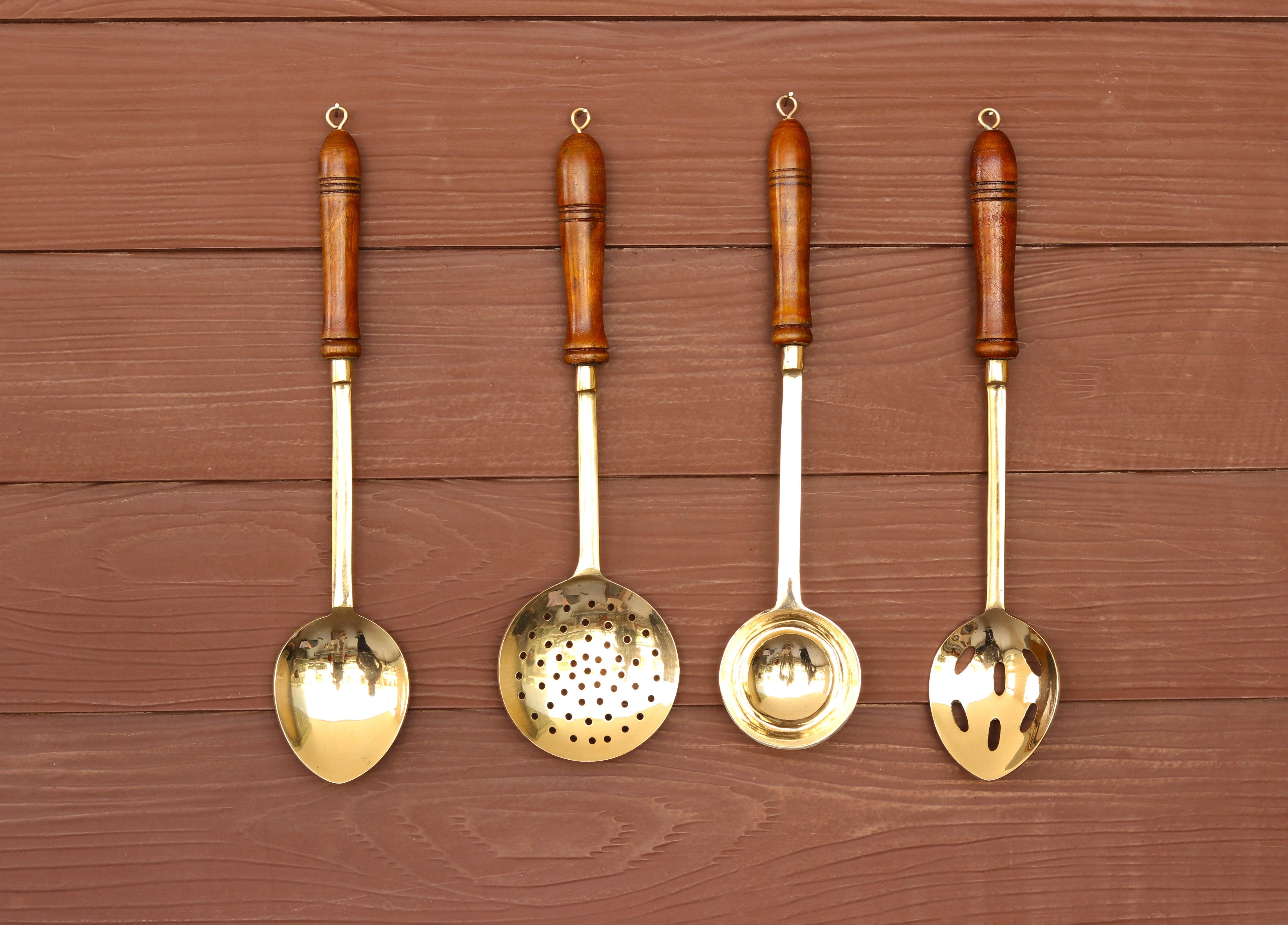 Brass Serving Ladles With Wooden Handles Set Of 4 | Kansa Kitchen Utensils