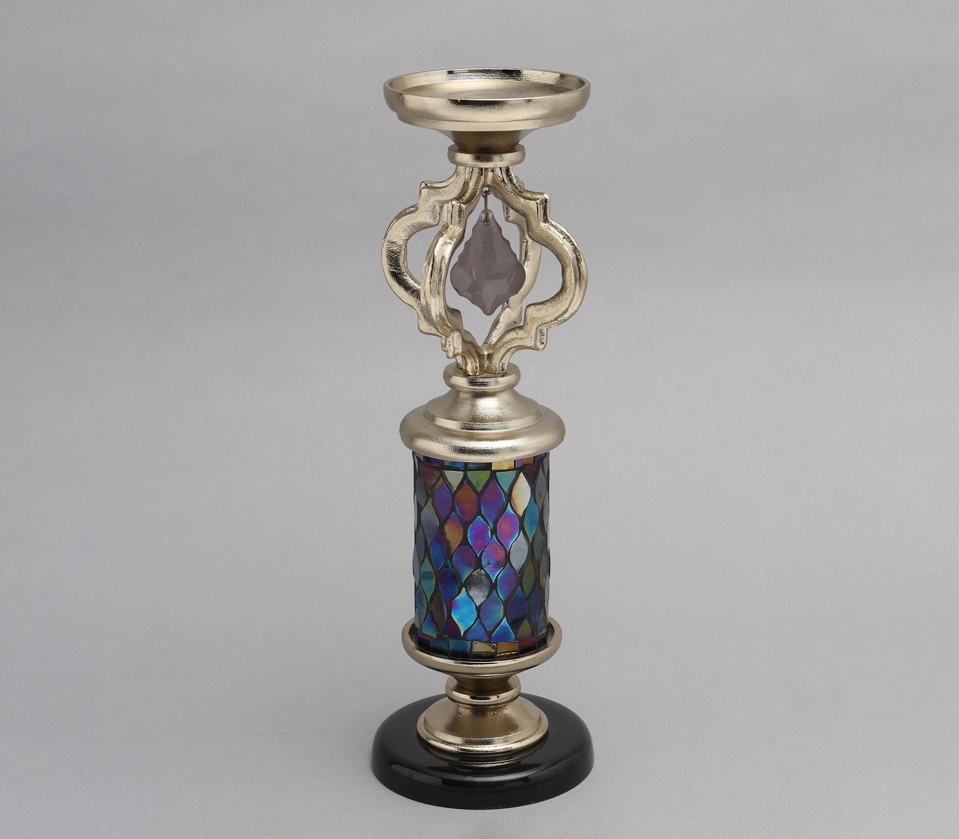 Add a hint of contemporary yet traditional design into any space with this axiom pillar candle holder. Masterfully crafted of gold finished and black powder coated aluminum and twinkling black and blue glass mosaic, this candle holder raises the bar of every home.