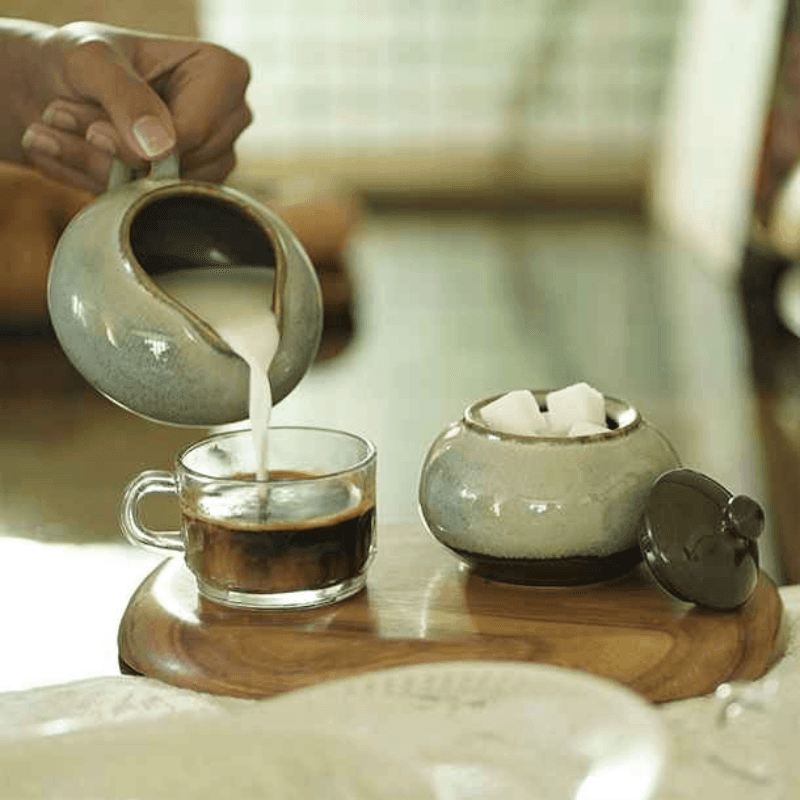 Corjuem Milk & Sugar Pot the perfect solution for your milk and sugar storage needs! Made from highquality cast ceramic, this stylish and functional milk and sugar pot set is designed to elevate your tea or coffee experience. Featuring a pot of milk with a small milk pot and sugar container, this set is a musthave for any tea or coffee lover. This milk and sugar pot set is inspired by traditional Indian "cheeni ke bartan" and is crafted to perfection with attention to detail. The durable cast ceramic material ensures that your milk and sugar stay fresh and protected from moisture and air, preserving their quality and taste.So why wait? Upgrade your tea or coffee setup with the Corjuem Milk & Sugar Pot set today and enjoy the convenience and style it brings to your home. Experience the joy of serving your milk and sugar in a chic and functional way with this beautifully crafted cast ceramic milk and sugar pot set, proudly made in India. Order now and indulge in a truly delightful tea or coffee experience.