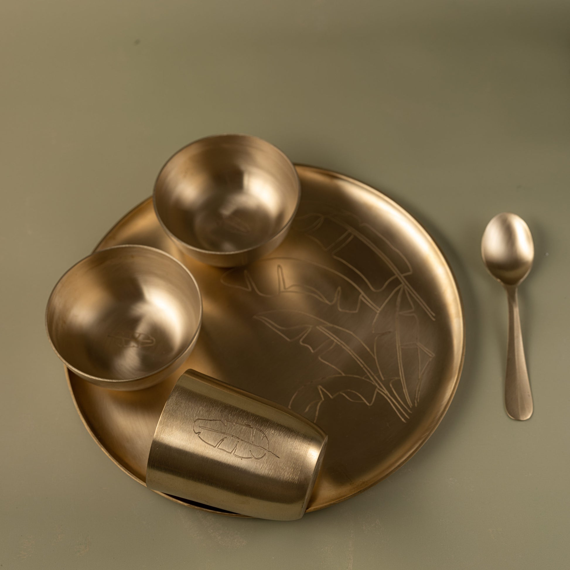 The complete brass dinner set with 1 plate, 2 bowls, 1 spoon and a glass. The leaf motif makes it unique and attractive. Add oomph and beauty to your table setup with this ethereal set!