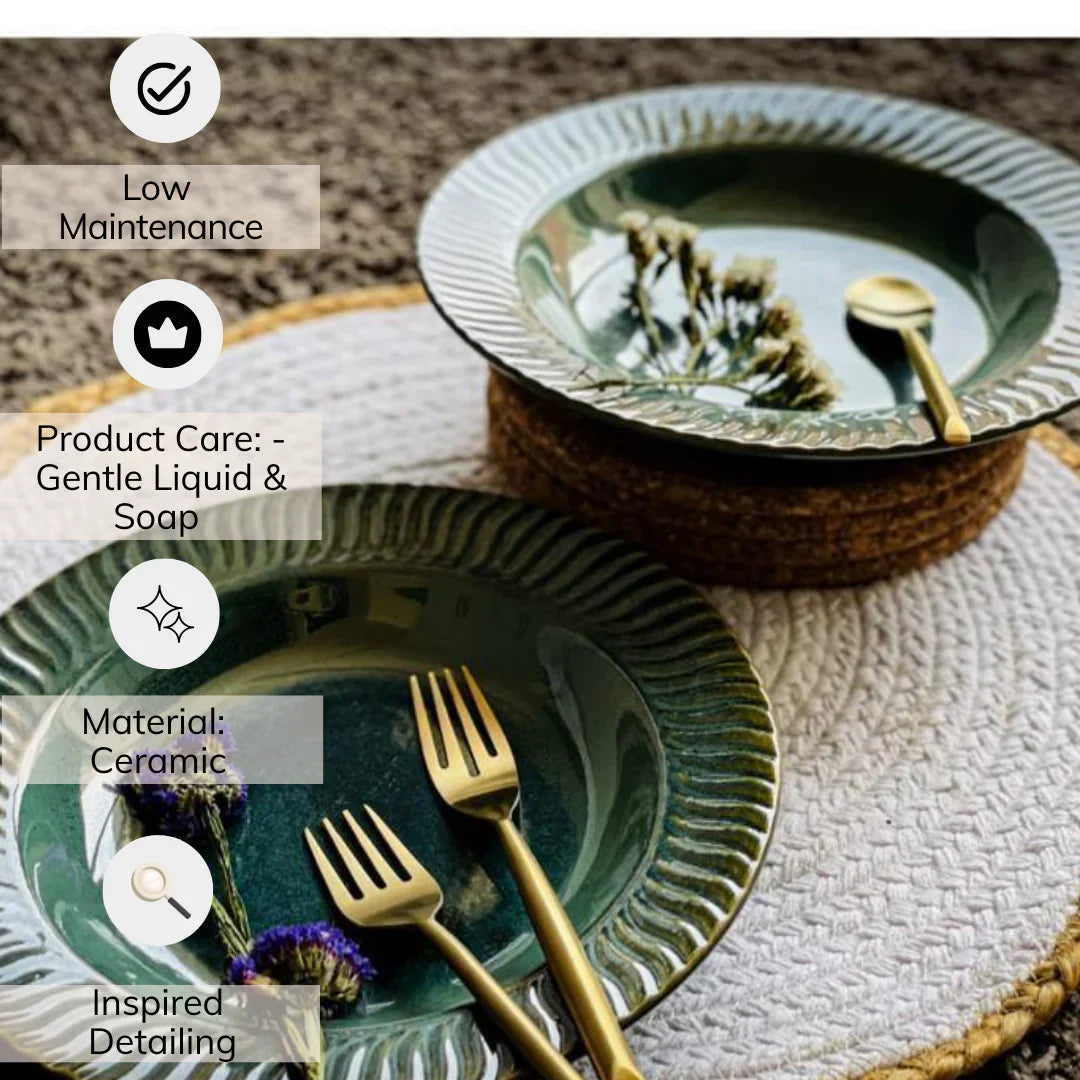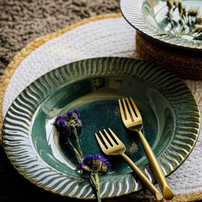 Add elegance to your dining experience with the Mer Deep Green Ceramic Plate, a versatile piece perfect as a ceramic pasta plate, serving plate, or even a fancy ceramic platter. Crafted with care, this ceramic plate features a rich deep green glaze that enhances your pasta presentation while doubling as a serving platter for snacks or desserts. Whether used for casual dinners or special occasions, it effortlessly blends function with aesthetics. This premium ceramic dinner plate is ideal for stylish tablescapes, making it a thoughtful gift or a statement piece in your collection. Use it as a pasta plate/ pasta platters, a snacks serving plate, or pair it with other ceramic plates to create a coordinated set. Elevate your plating and impress your guests with this elegant, functional, and durable dish. Complete your setup with our fancy platters, ideal for serving snacks or gifting to loved ones. Enjoy your favorite pasta dishes in style and sophistication.