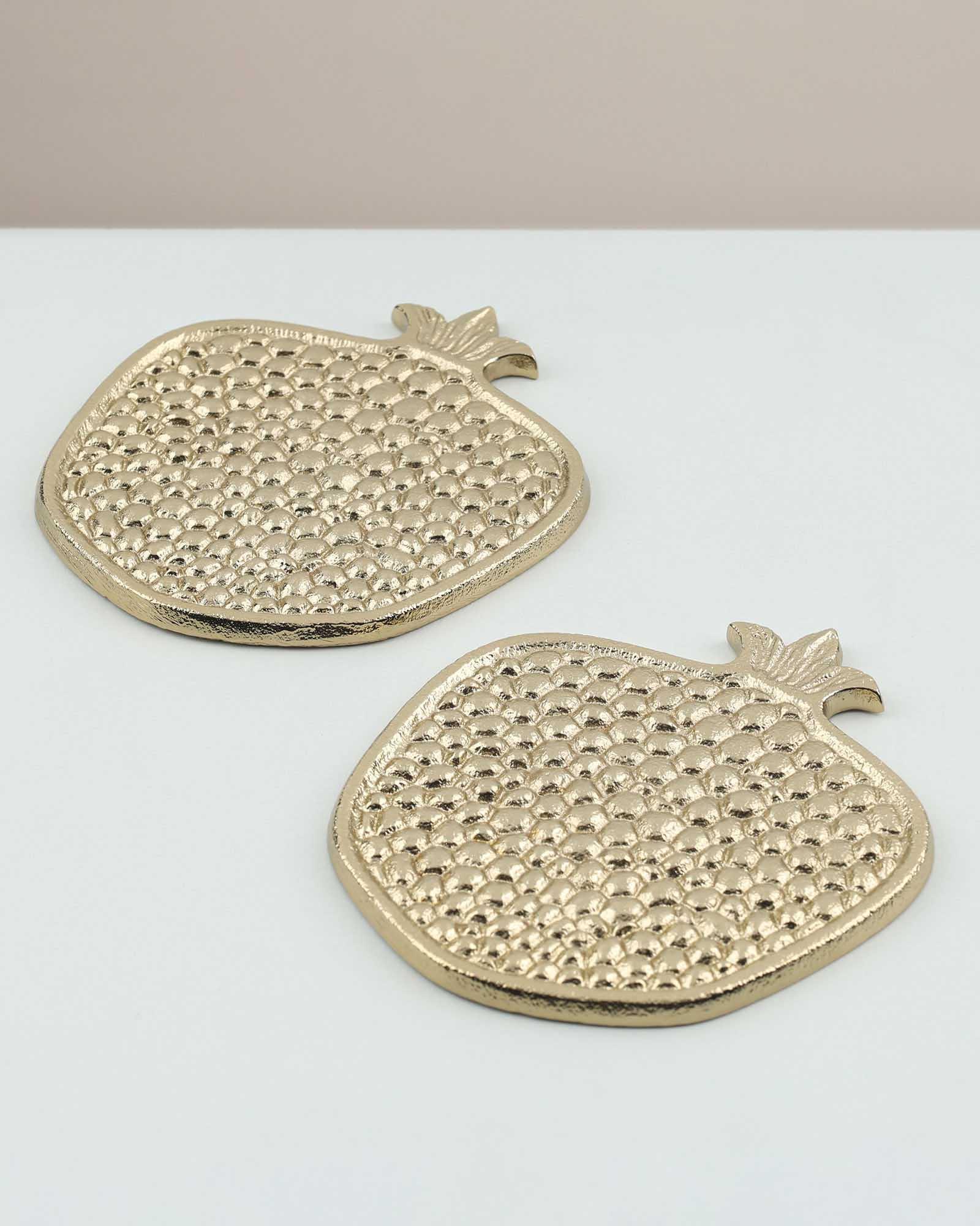 Indulge in the luxurious beauty of the Roma Coaster Set Of 4, featuring a stunningly crafted pomegranate motif. Made from lightweight yet durable aluminium, these coasters offer both strength and a sleek, polished finish. Not only do they protect your furniture from watermarks, heat, and stains, but they also add a touch of sophistication to your dining or coffee table. It's not just about practicality - these coasters are also a gorgeous decor piece, enhancing any interior from modern to traditional. A perfect gift for housewarmings, weddings, or any special occasion, combining elegance and functionality in one stunning set.