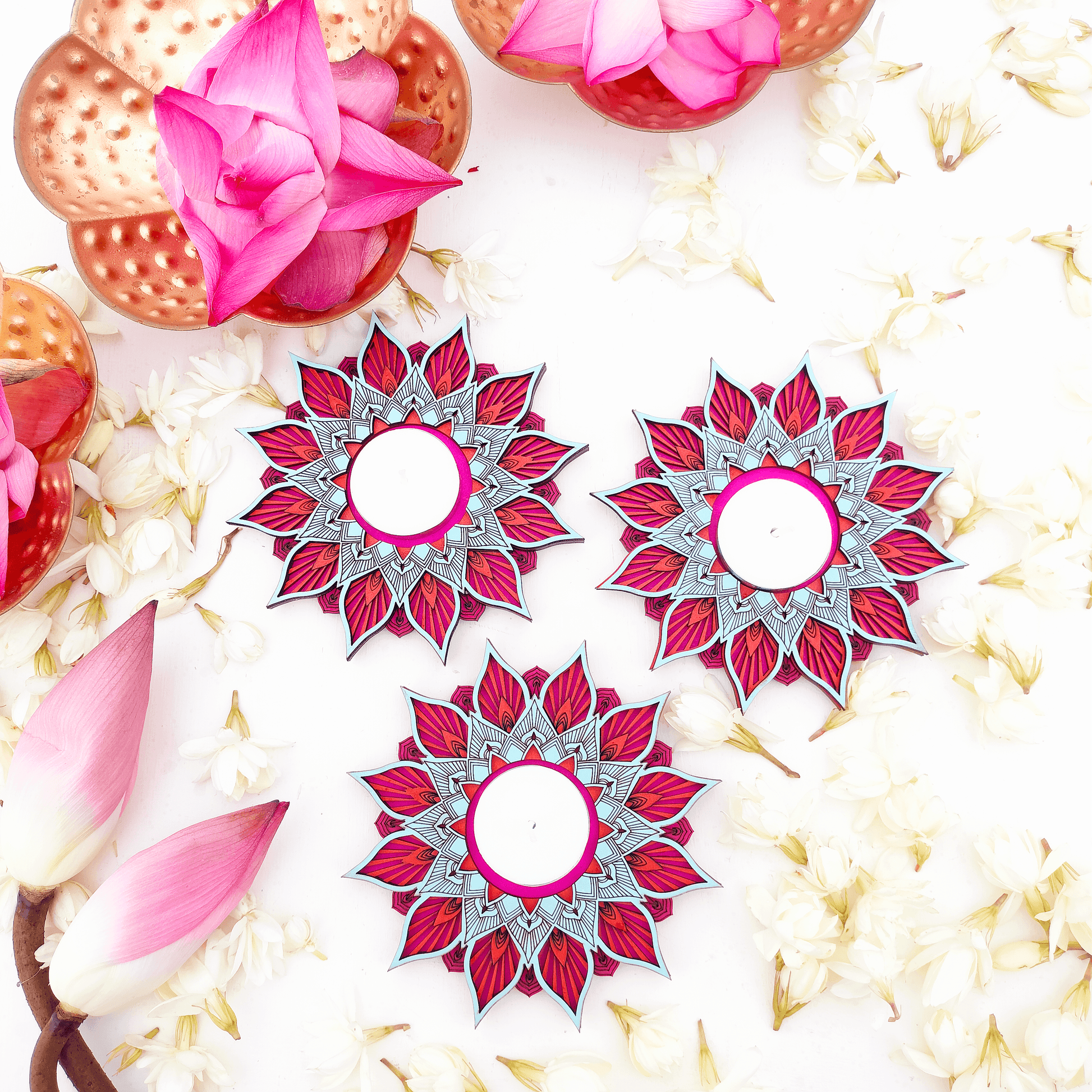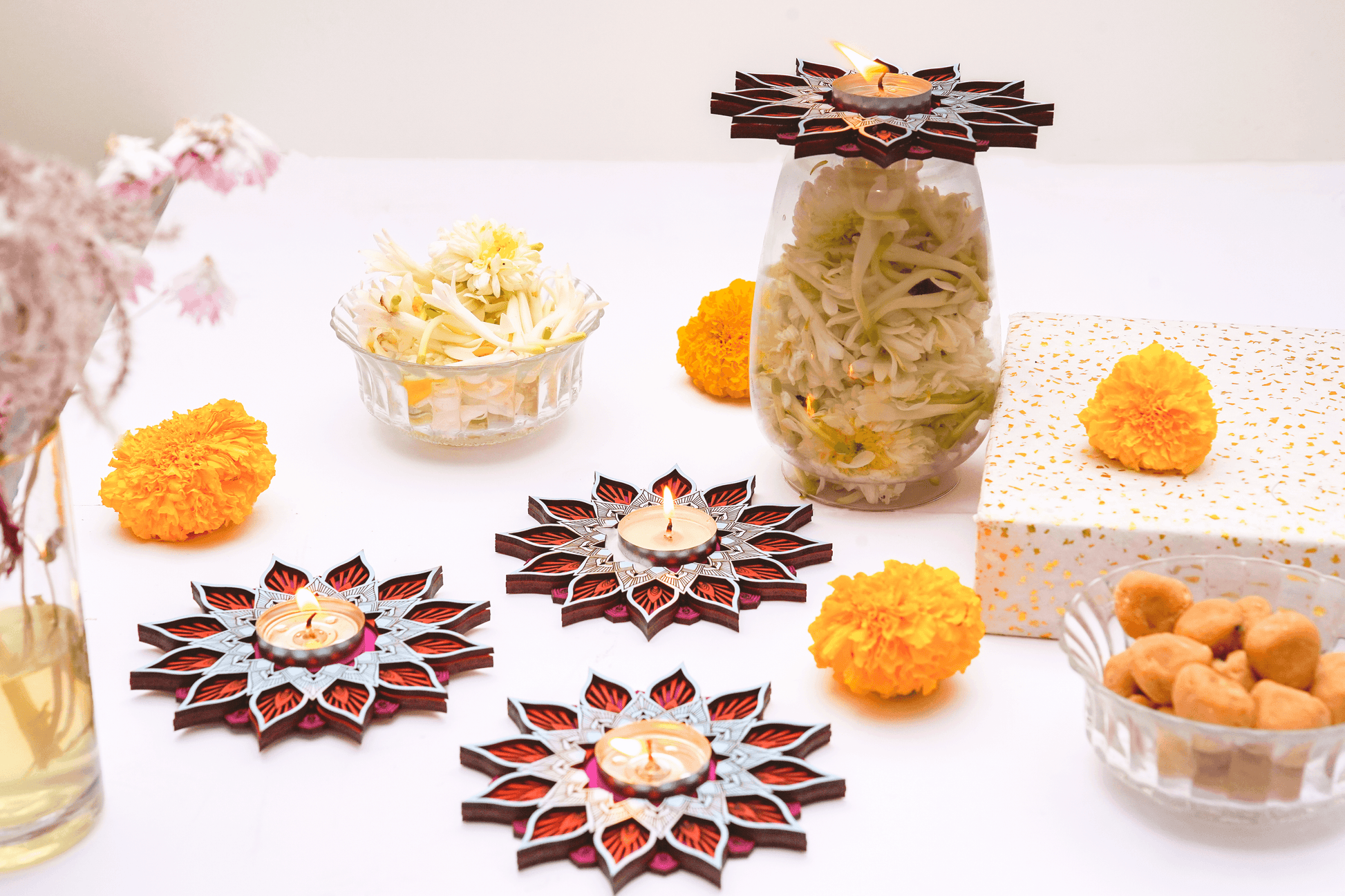 Introducing the Blue Eyed Blossom Decorative Candle Holder, the perfect addition to elevate your decor. These exquisite tealight holders are designed for versatility, beautifully accommodating candles or diyas. Ideal as a candle stand for living room decor, they also enhance tealights for dining table decor and office table settings. Perfect for the kitchen, these stylish candle stands bring elegance to temple and pooja room decor. Each piece is meticulously crafted to capture the essence of this charming flower, adding a sophisticated and elegant element to your festive arrangements. Illuminate your space with these delightful tealight holders and create a warm ambiance.