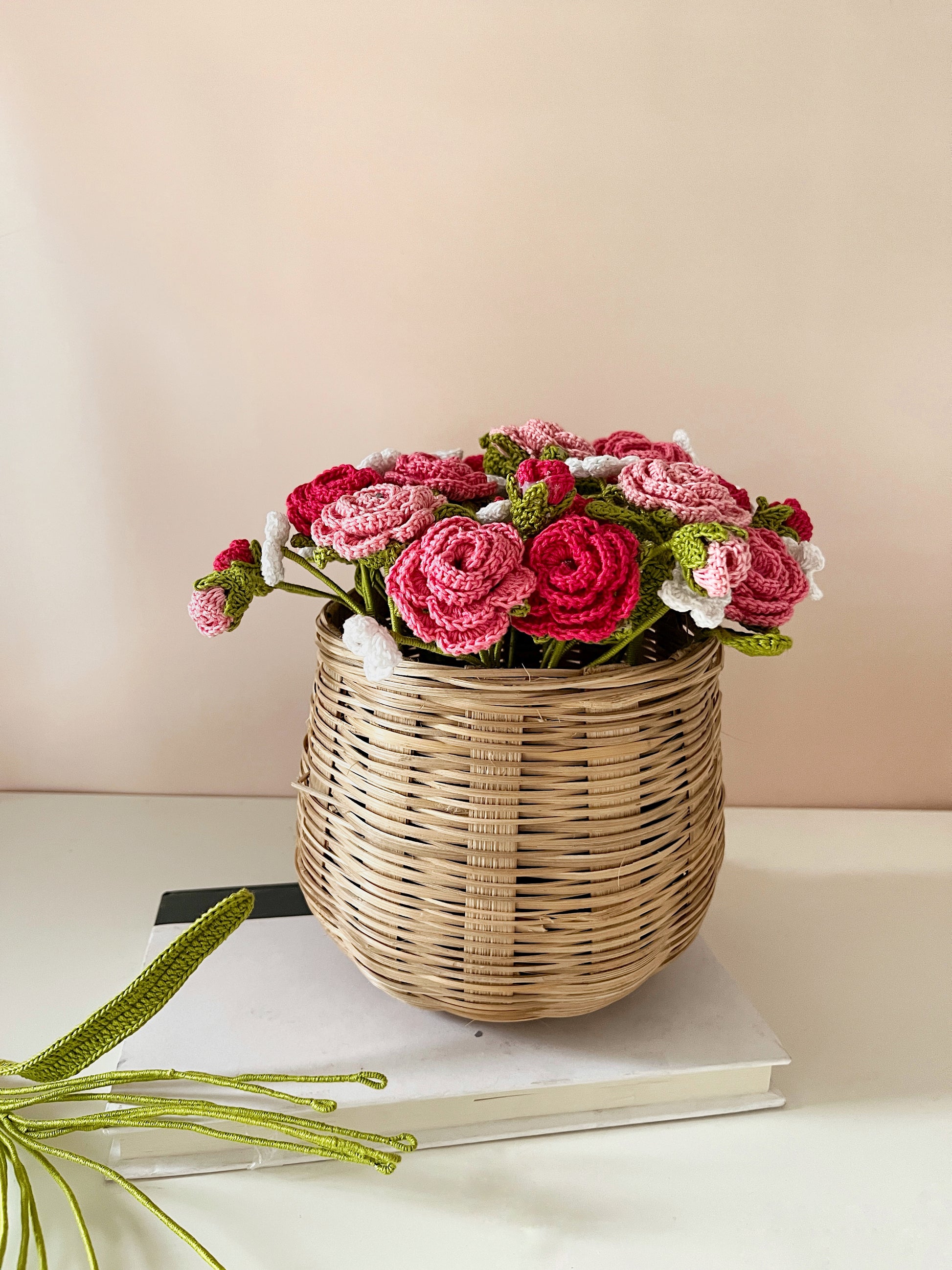 Write down your blessing and give it along with the basket to people you love. Whether you’re looking to brighten up your living room, add a cozy touch to your bedroom, or gift something unique, this Crochet Flower Basket is the perfect choice. Basket Includes:28 mix pink and dark pink flowers with white and pink small buds. Handmade with Care – Each stitch is lovingly crocheted to create a sturdy yet delicate design. Versatile Use – Ideal as a centerpiece, shelf decor, or a rustic-chic gift for loved ones. Durable & Lightweight Made with high-quality yarn for lasting beauty while remaining easy to move and arrange.