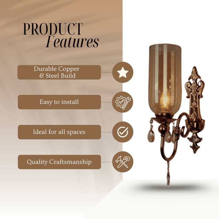 Make a bold style statement with this European-style wall lamp/ wall lights, a truly unique decorative lighting fixture designed to elevate the aesthetics of your space. Crafted from mild steel and aluminium, it features a long cylindrical golden translucent glass shade paired with a luxurious copper finish, blending elegance with timeless charm. The wall lamp / wall lights / bedroom wall lights showcases intricate details like a hand-carved base, gracefully curved arms, ornate bobeche, and hanging crystals, all contributing to its rich, vintage-inspired appeal. This wall light / wall light lamp is an ideal choice for transitional home décor, combining both classic and contemporary elements. Perfect for hallways, living room wall lights, bedrooms, or entryways, this vintage European wall sconce adds a sophisticated glow and a touch of opulence to any interior setting.