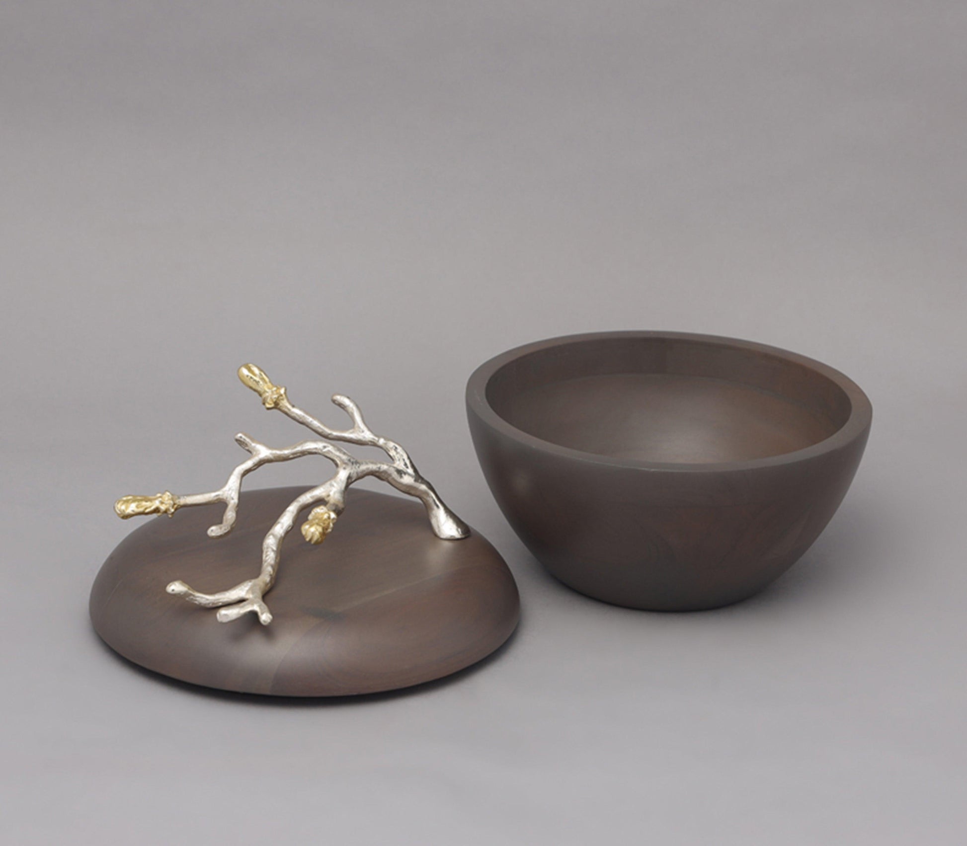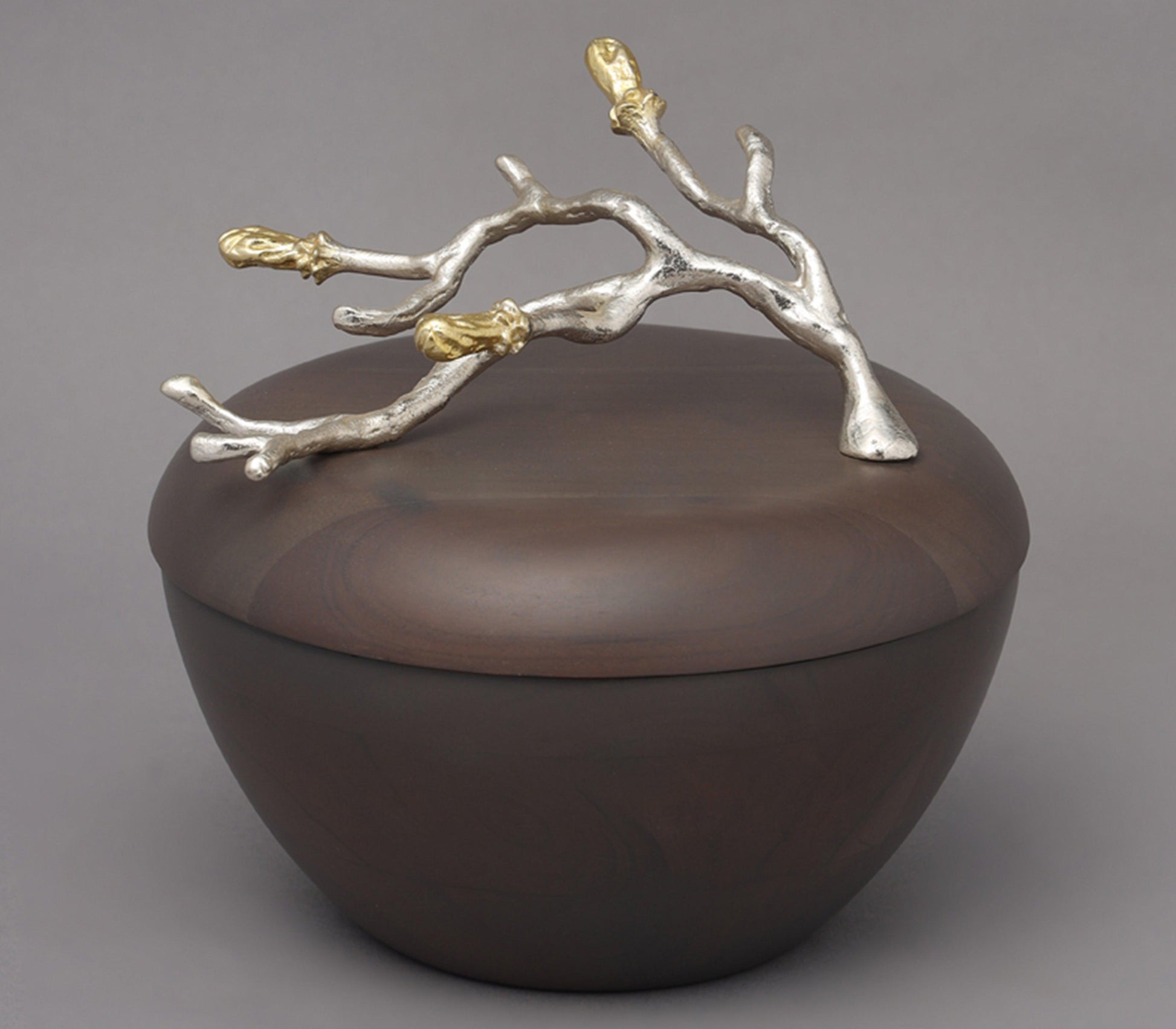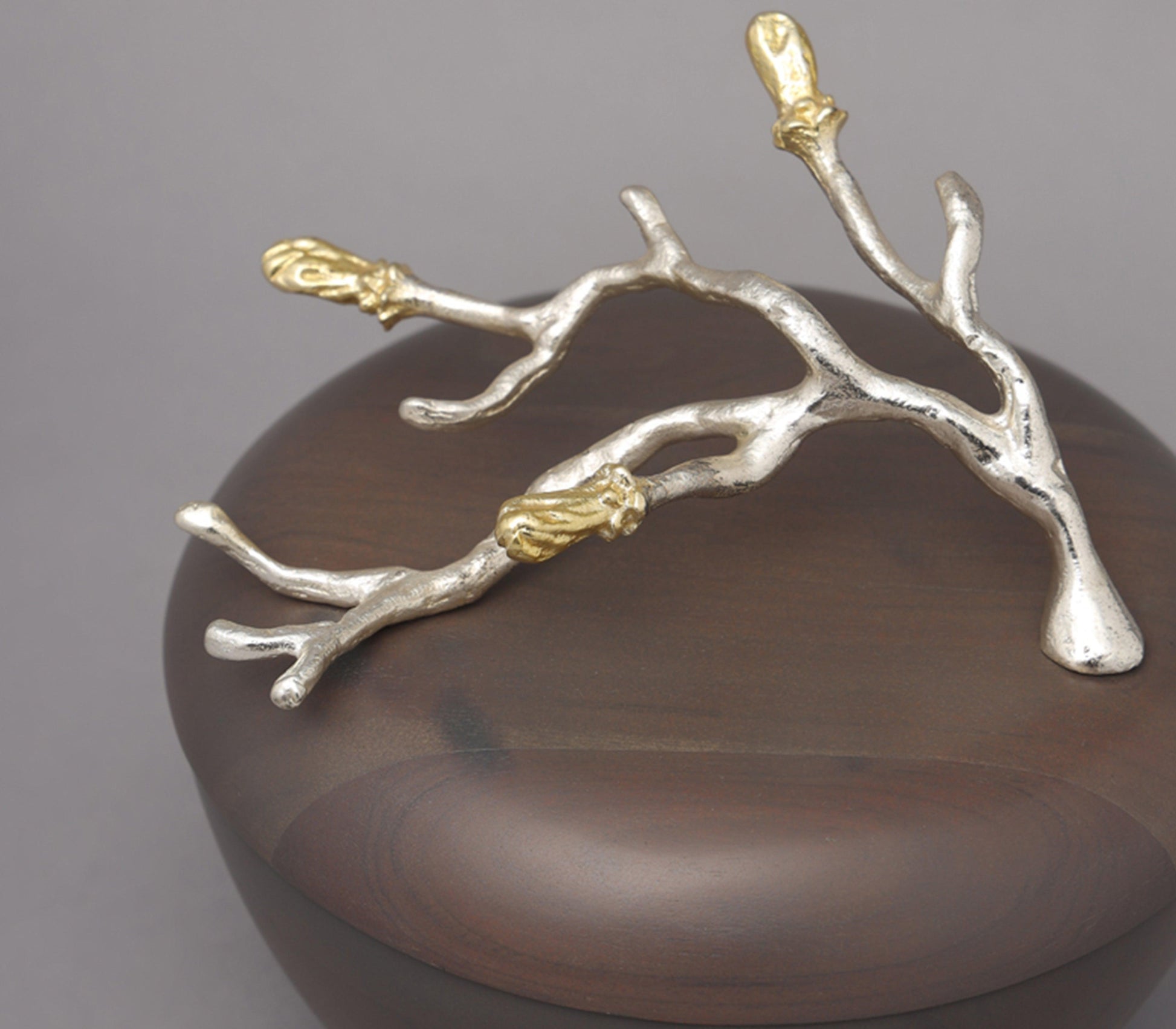 Mimicing the ever enchanting blossoming of a bud as it grows, the buds with wood jar is a timeless addition to your delightful home. The gold and silver plated aluminum artistry is tenderly wrapped around the walnut finished wooden jar. Use it as a chic extension to your tea party set, or as an addition to the entire set of buds with wood pieces.