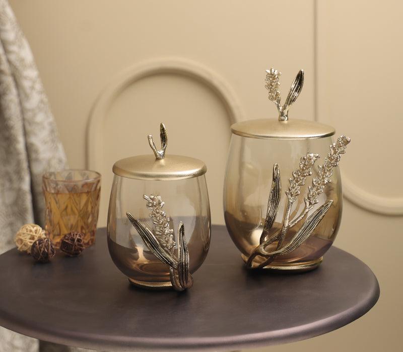 The whispering wheat jar is a stunning testament to the beauty of artisanal craftsmanship. Made from a blend of gold-finished and enamelled aluminum, this elegant jar features a captivating half brown luster glass body that adds depth and warmth. The unique design evokes a sense of nature with its subtle hints of wheat-inspired detailing, making it a perfect addition to any decor style. Ideal for storing cherished items or as a decorative accent, the whispering wheat jar brings a touch of sophistication and organic charm to your home, enhancing any space with its refined elegance.