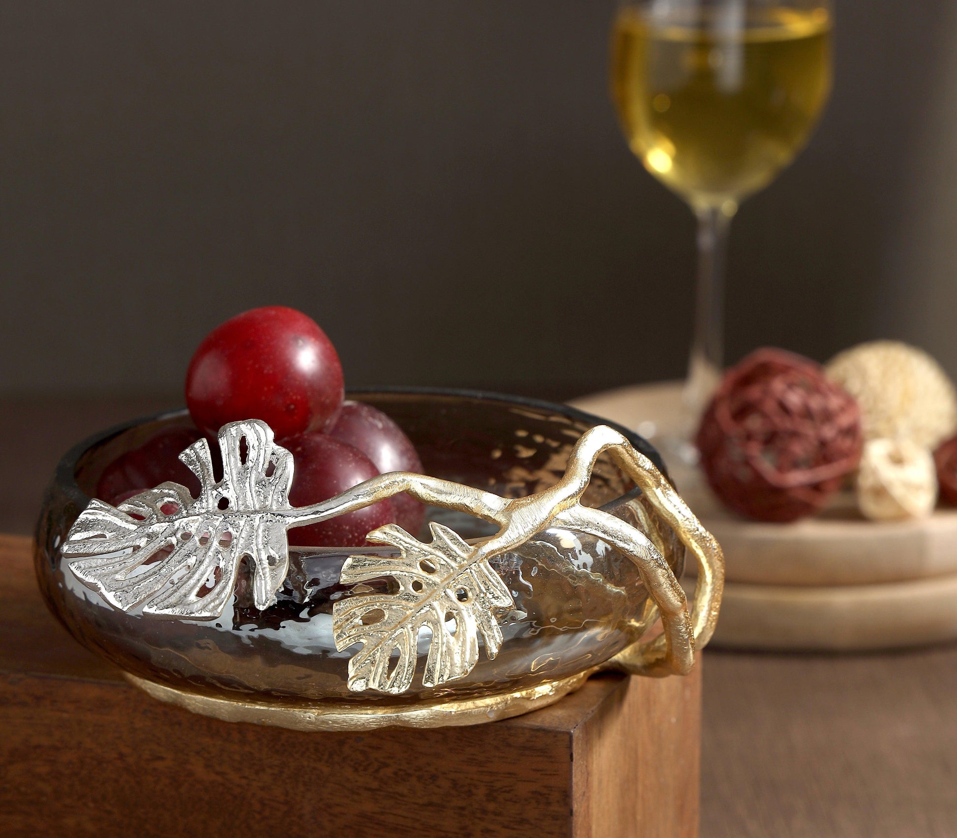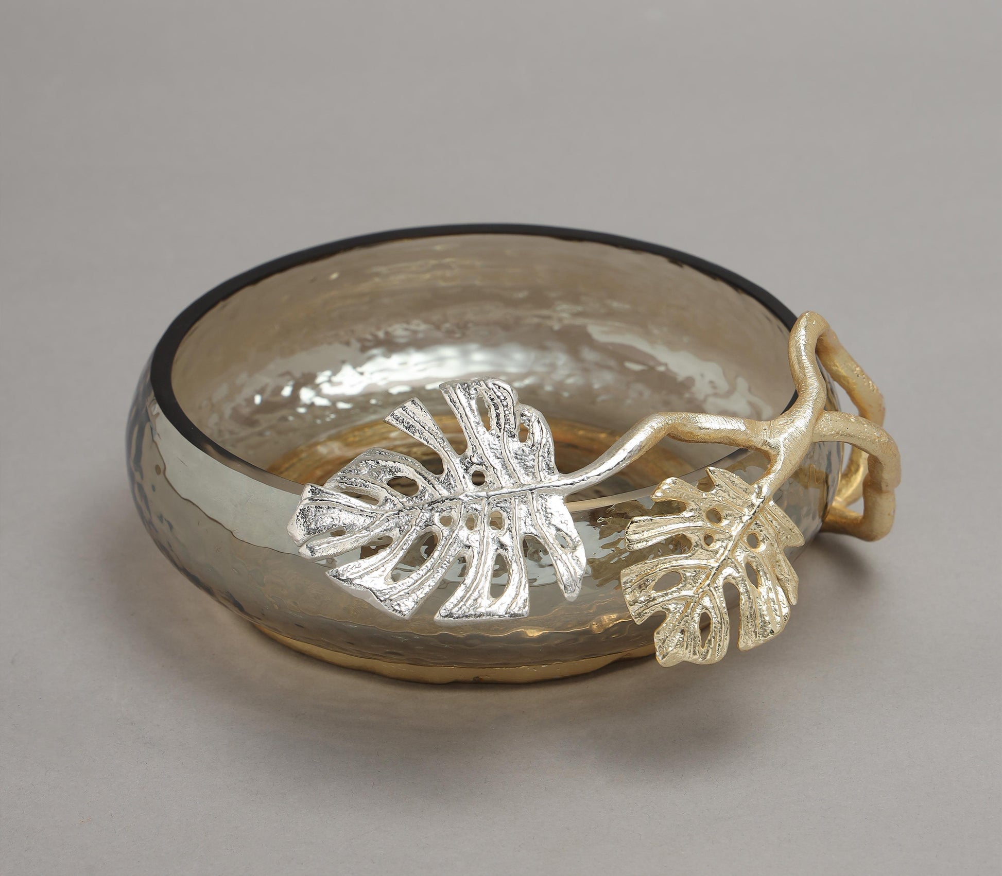 Carefully handcrafted of gold finished and nickel plated aluminium with textured smoke luster glass, the monstera leaf bowl brings a whiff of the easy breezy island vibe to your home. Use these lush decorative bowls in different sizes & shapes to elevate your home's design scheme. Perfect for enhancing your luxury home decor, this decorative bowl works beautifully in various sizes and shapes, allowing you to elevate your design scheme. Whether displayed as a centerpiece, used for fruits, or as an accent piece on a console table, the Monstera Leaf Bowl is a true testament to craftsmanship and style. The Monstera Designer Leaf Bowl is the ideal choice for those looking to add a tropical touch and luxury accent to their decor. Its unique design and high-quality materials make it the perfect addition to any modern home.