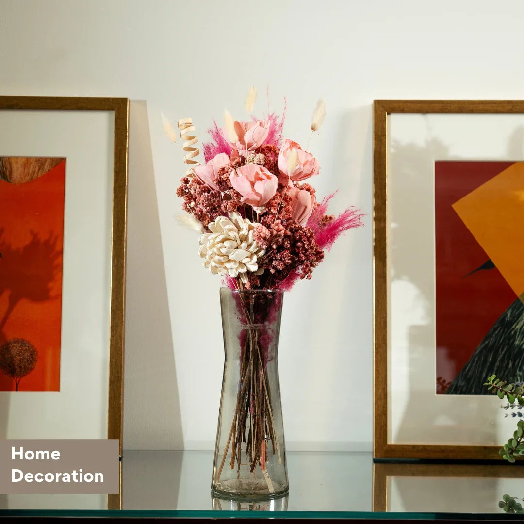 Add a scoop of charm to your space with this beautiful bunch of soft pink peony-style dried flowers. Handcrafted for décor lovers, the Peony Scoop brings a gentle, romantic feel to living rooms, bedrooms, work desks, or gifting moments. Its delicate petals and natural texture make it perfect for vases, shelf styling, or as a centrepiece .