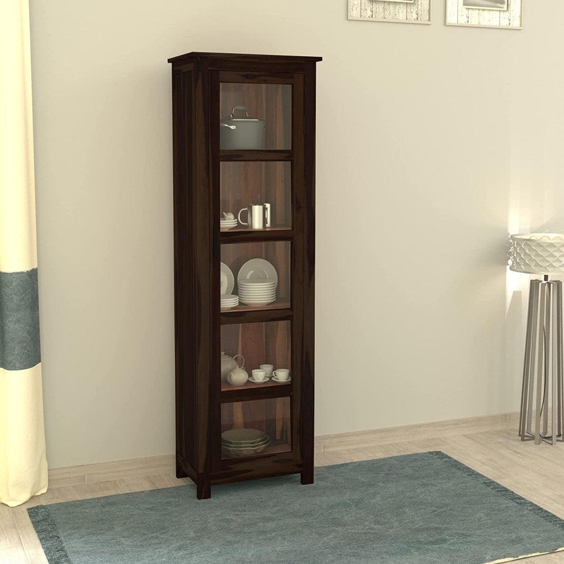 Sheesham Wood Baltimore Kitchen Cabinet Tall In Walnut Finish | Bookcase With Glass Door