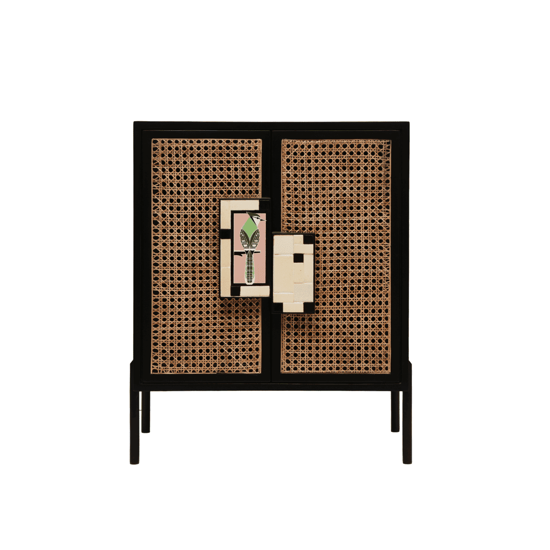 Introducing our striking black bar cabinet, designed to captivate with its bold aesthetic. The cane detailing on the shutter adds a touch of texture and sophistication, while the handles feature a unique mosaic tile pattern adorned with charming bird motifs. Elevate your space with this fusion of contemporary design and artisanal craftsmanship, making a statement that is both classy and functional.