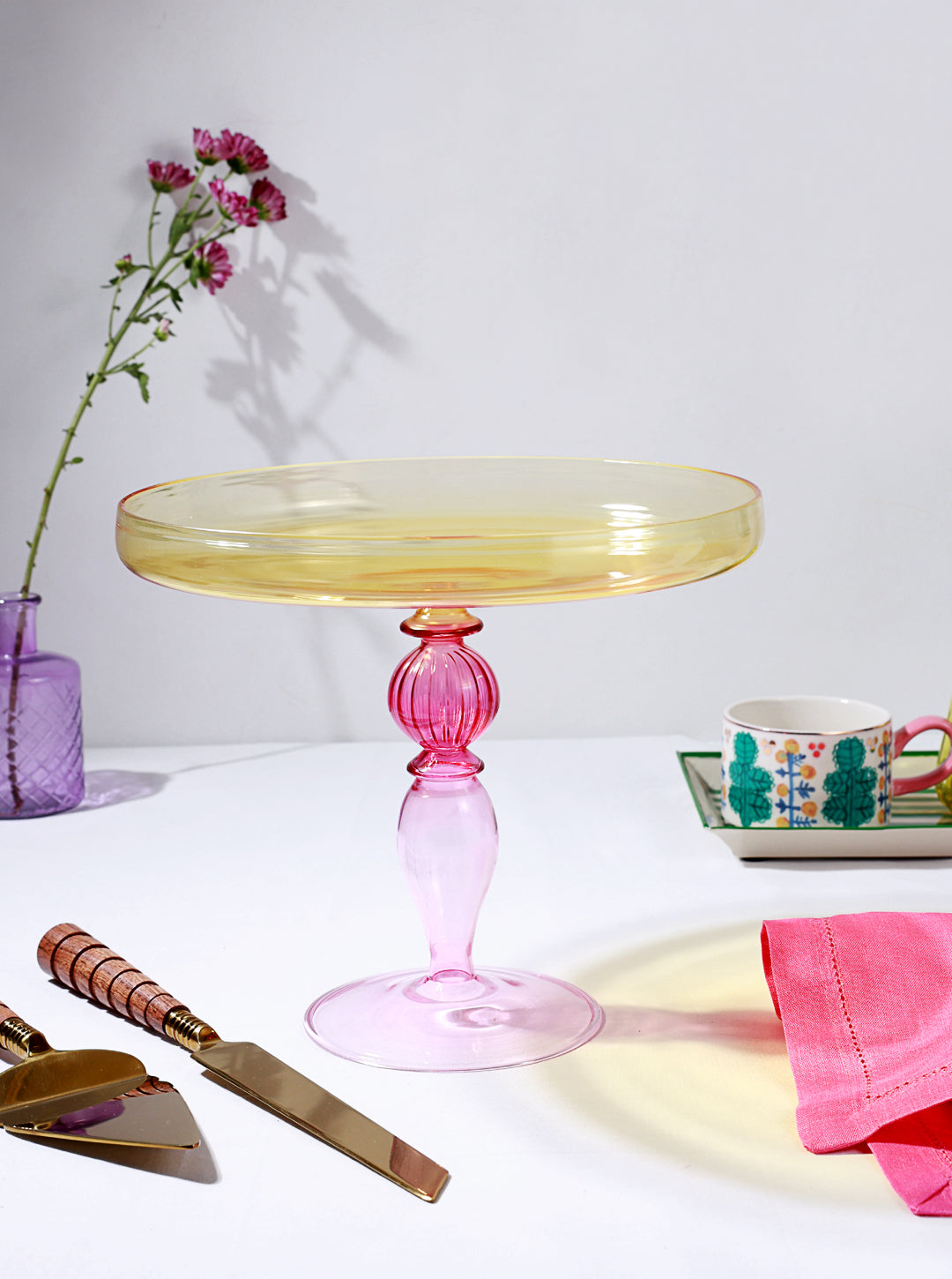 Meet the Solē Cake & Serve Duo—a match made in dessert heaven. Featuring a showstopping glass cake stand in sunny yellow and blush pink, paired with a chic gold and wood server set, this duo adds instant charm to any celebration. Fun, functional, and made to impress—because every slice deserves the spotlight.