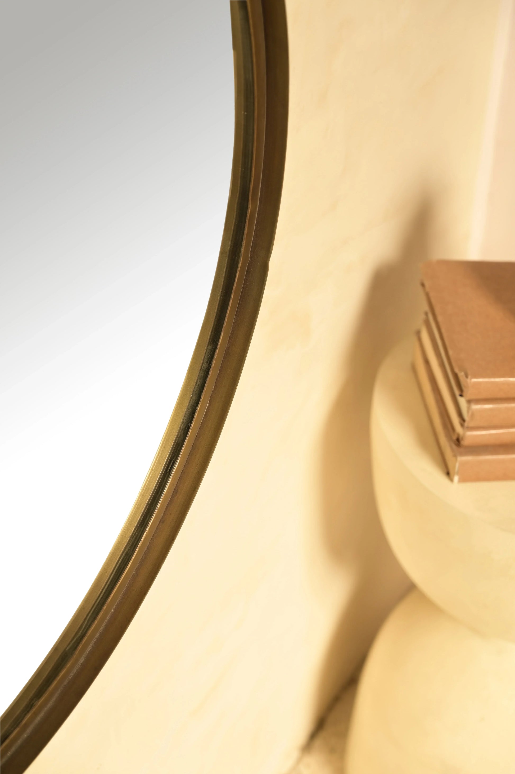 Framed in antique brass, this hanging wall mirror brings an industrial elegance to any space. With its warm patina and minimalist silhouette, it is perfect for hallways, bedrooms, or above a.