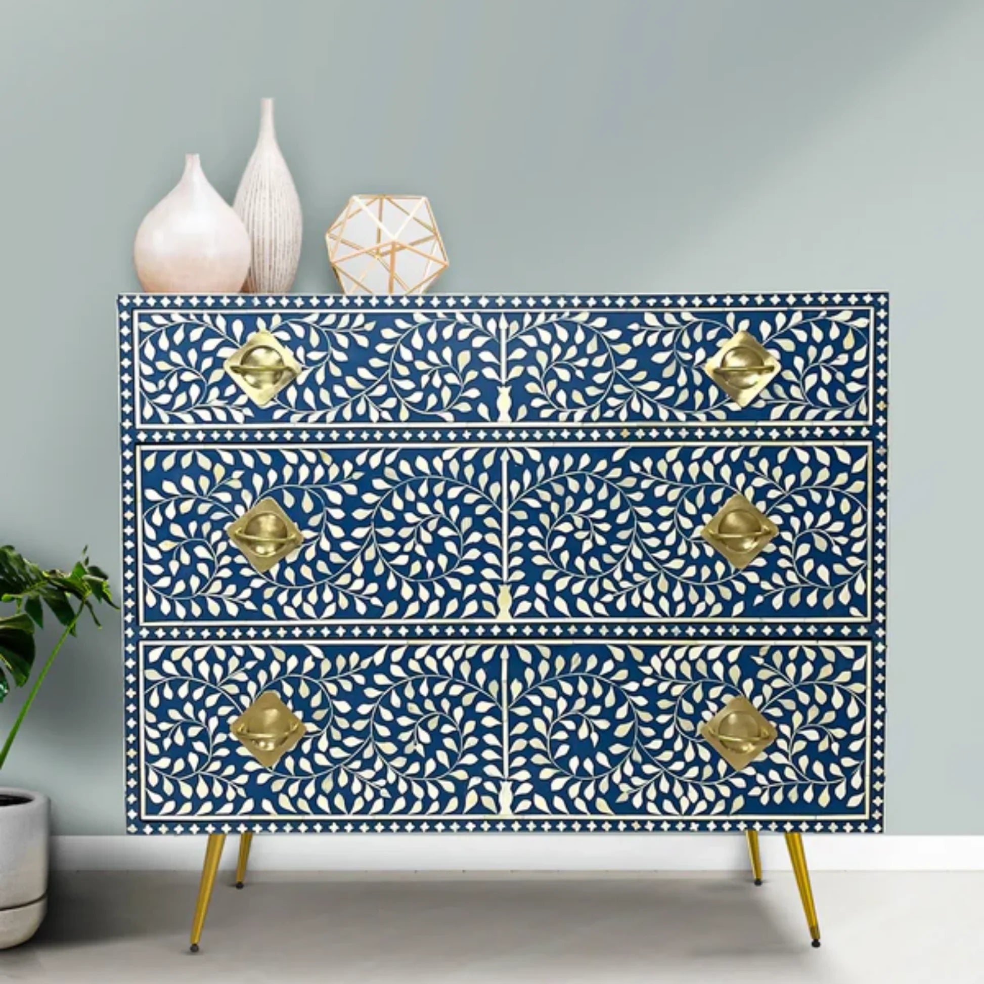 This three-drawer dresser is a truly luxurious way of accenting your bedroom. Each piece has been handcrafted in a process that can take weeks using honourably sourced Bone. Delicately carved pieces of bone/MoP have been individually inlaid onto a wooden frame in an elaborate pattern. Layers of coloured resin are then used to fill around the bone/ mop. Finally, the backside and inside areas are painted with the matching colours.