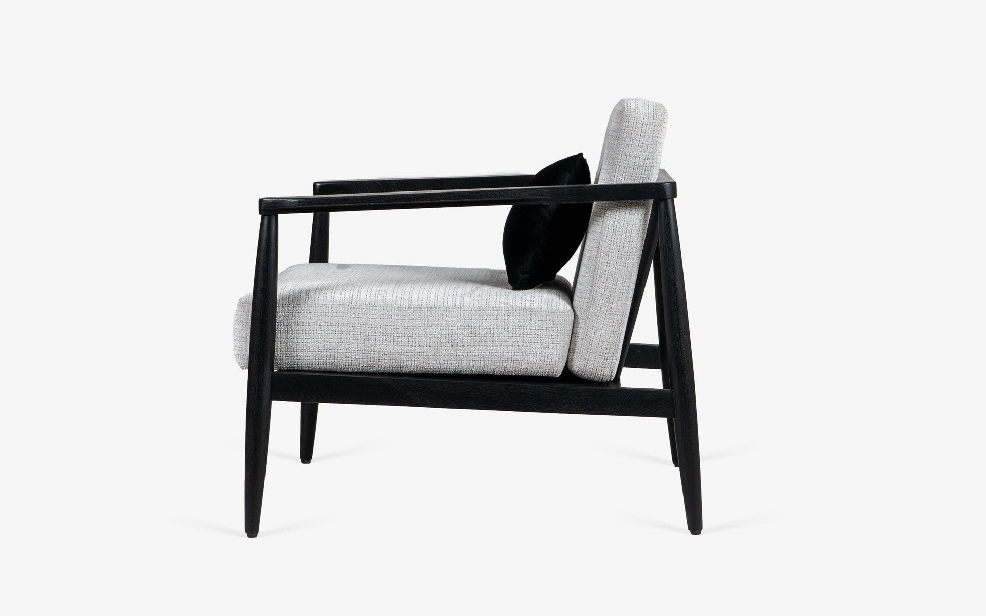 The Archie Spindle Lounge Chair is inspired by yarn twisting sticks, blending relaxed sophistication with modern charm. It features a contrasting lumbar cushion for support, elegantly angled arms, and tapered legs, making it a timeless addition to any living space or reading nook.