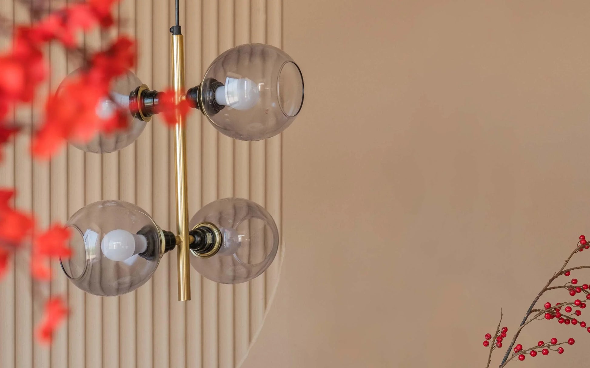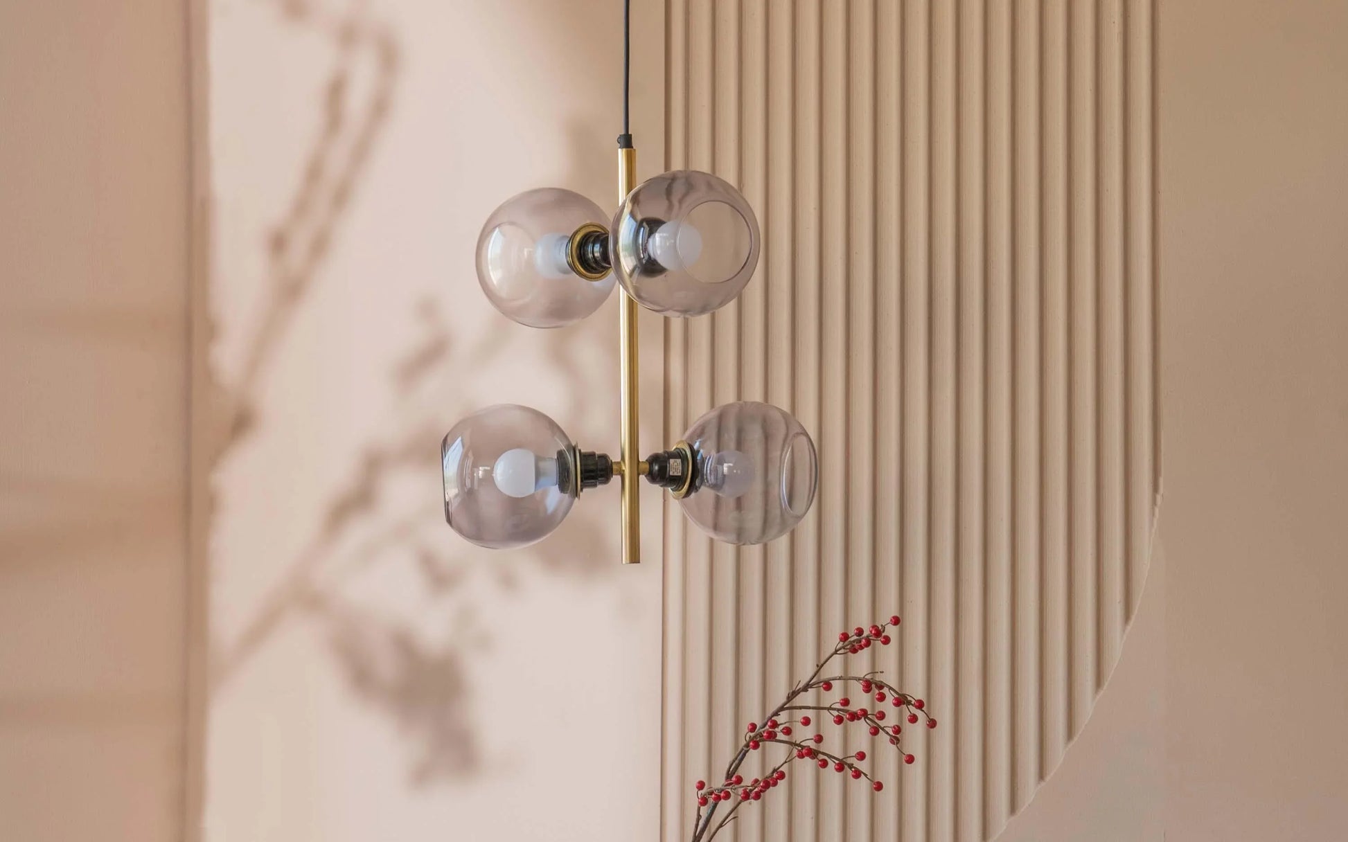 Our modern, mobile-like chandelier casts a soft light in all four corners thanks to smoky grey glass globe shades. Positioned at right angles, each of the two iron rods is outfitted with a globe at each end for room-wide illumination. The chandelier's brass-finished fixtures and traditional collars and connectors give Bayo a vintage vibe, while its clean lines keep it contemporary.