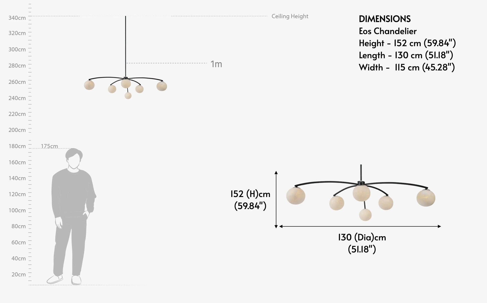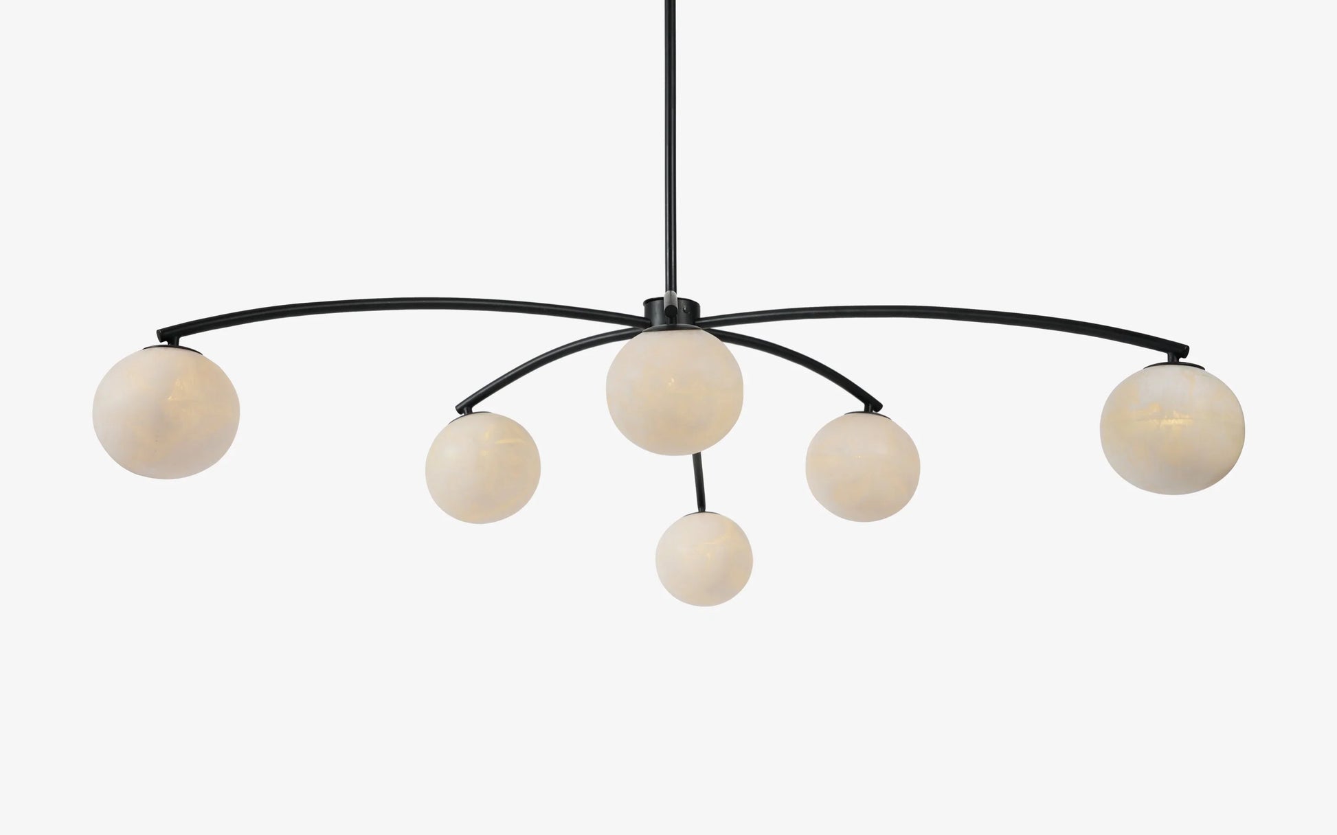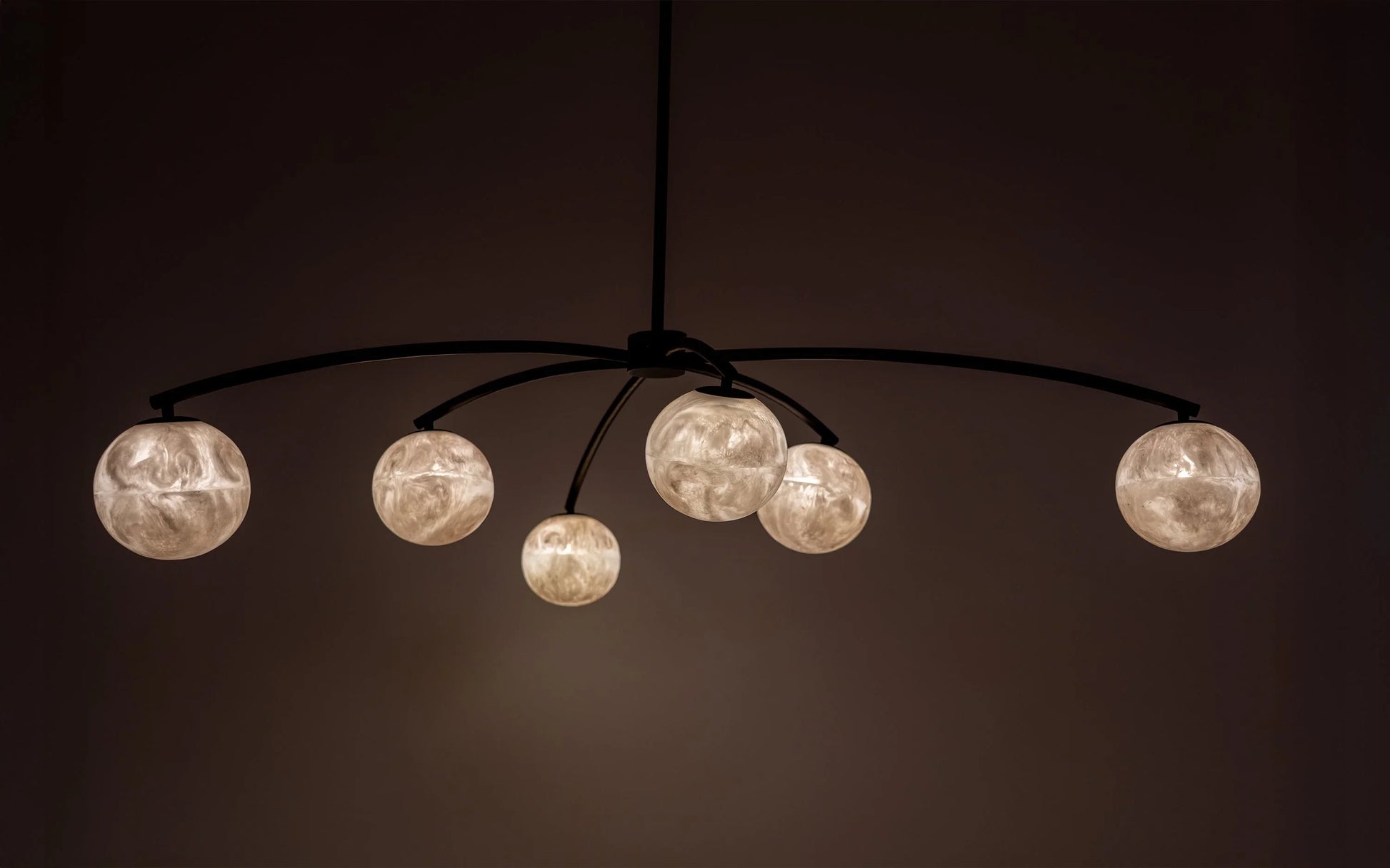 The Eos Chandelier reimagines mid-century lighting with a white marble resin body and slim black arms. Lightweight yet striking, it suits high ceilings and dining areas with timeless visual drama.