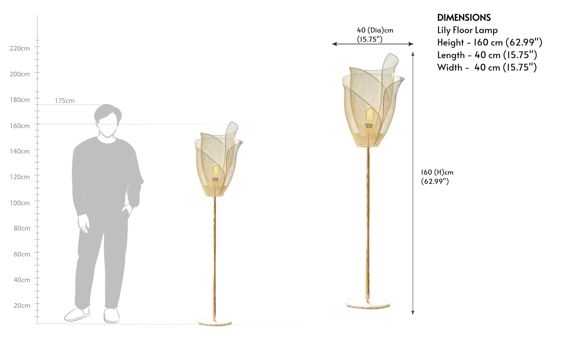 Bring elegance and grace to your home with the Lily Floor Lamp, where layers of metal mesh appear to float in mid-air, forming a soft, blooming lily silhouette. The floor lamp’s asymmetrical curved shade allows light to filter gently, creating an airy and ethereal ambiance. Crafted with a combination of mild steel, natural cane, and white marble, this floor lamp/ standing lamp is as much a sculptural statement as it is a source of illumination. Perfect for living rooms, bedrooms, or cozy reading nooks, it adds a touch of contemporary sophistication to any interior.