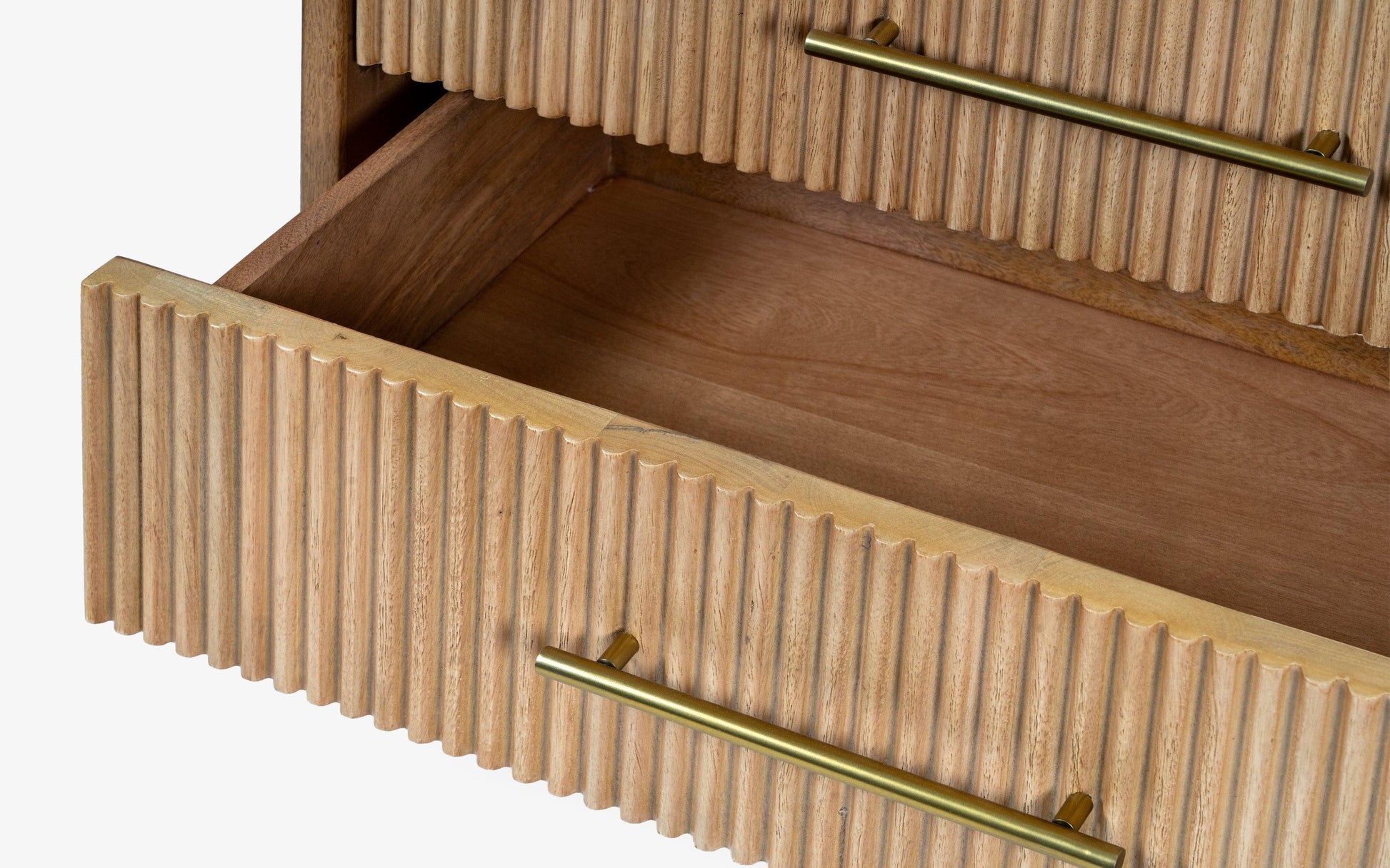 he Linn Chest of Drawers beautifully combines elegance and functionality with its soft curves and intricate fluting. Made from durable mango wood and veneer, it features a two-toned walnut finish and versatile brass handles. This collection offers practical storage solutions and can be used in living rooms, bedrooms, or dining areas.