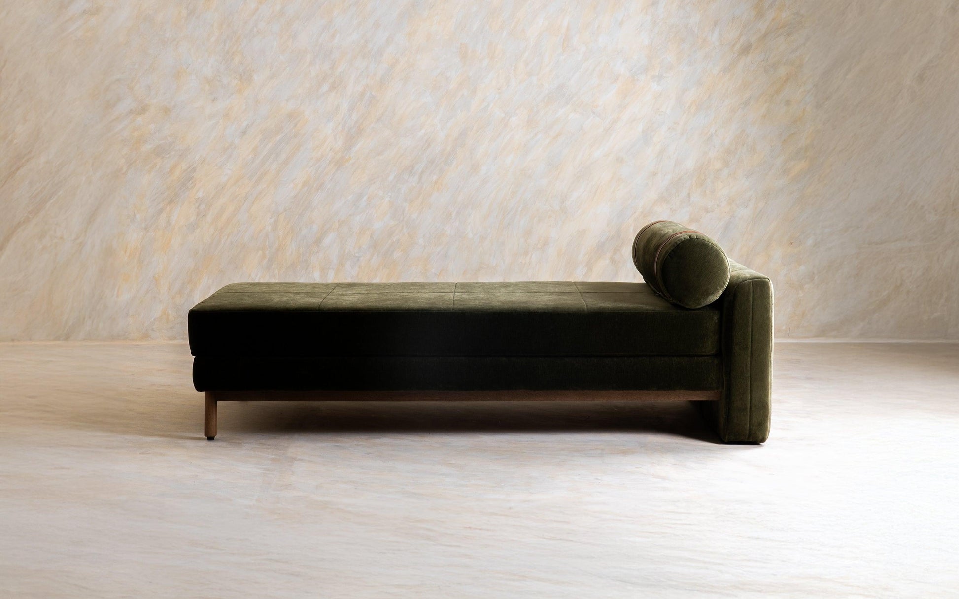 Relax in style with the Solace Daybed with Arm, blending modern aesthetics and comfort. This elegant piece features a sleek upholstered handrest and a cylindrical bolster pillow for support and visual appeal. Its elevated frame and slim wooden legs provide a light, airy presence while ensuring durability and stability.