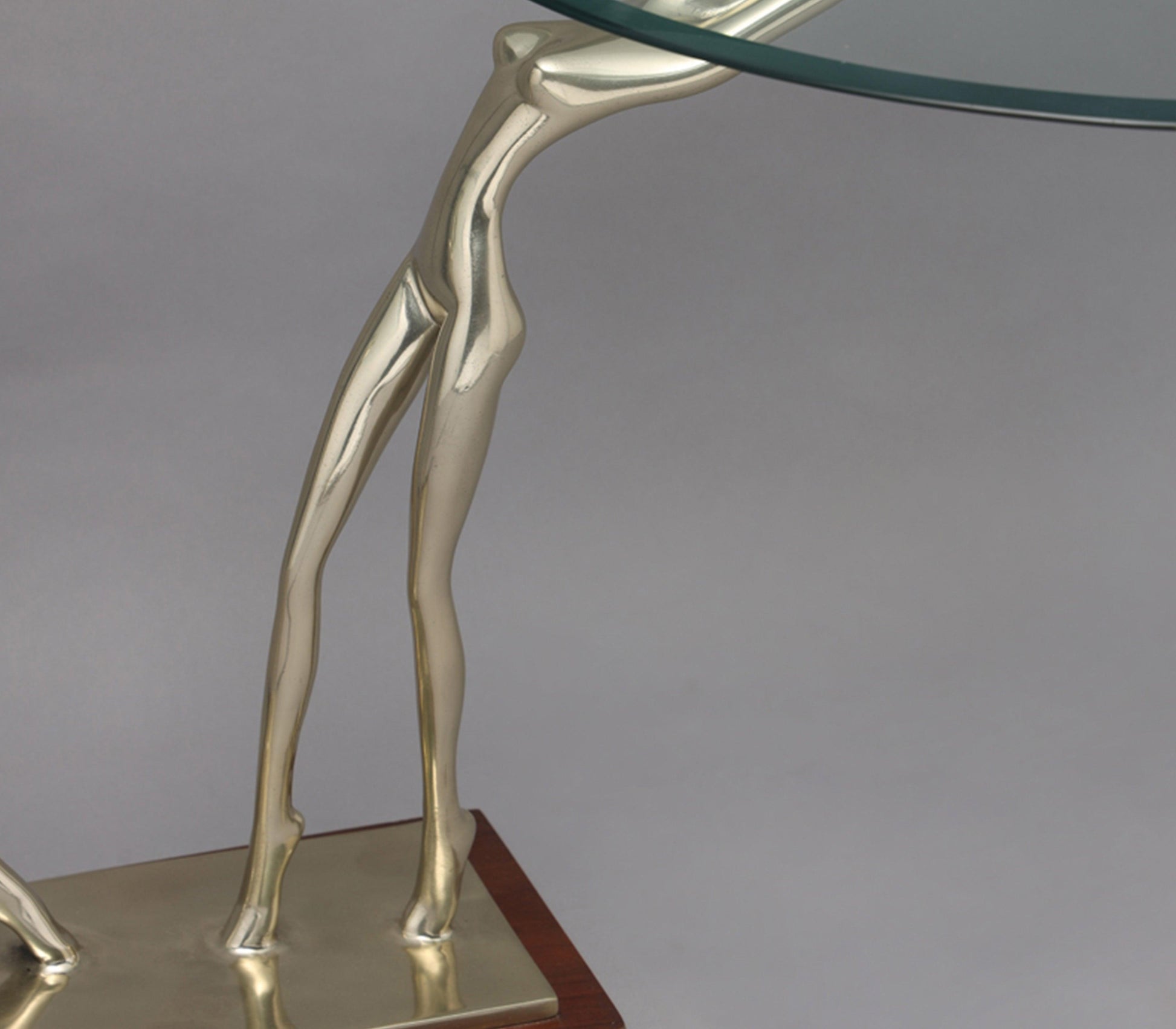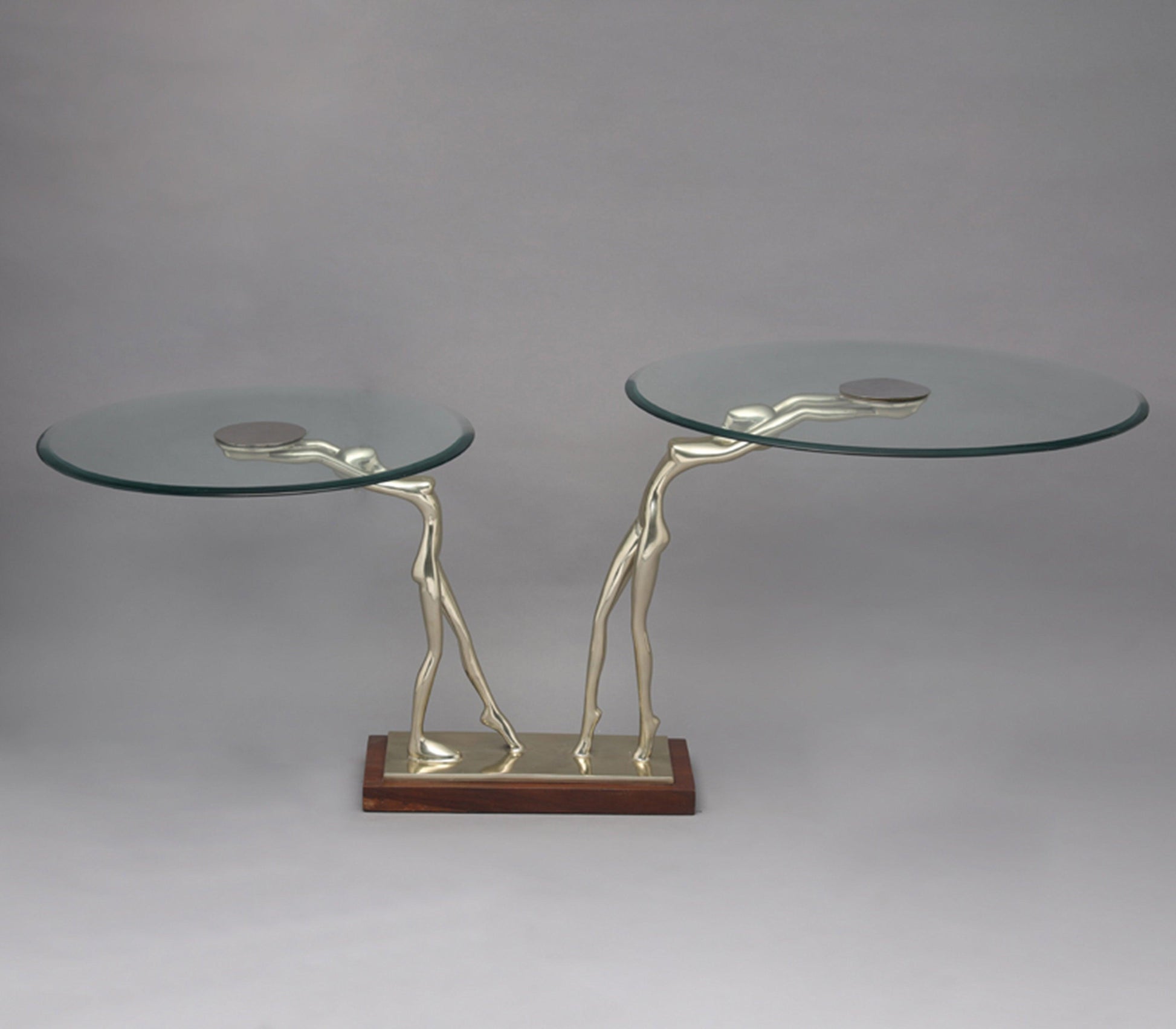 The ballerina accent table is an ode to the grace and form of ballerina's. Beautifully crafted of polished gold finished aluminum and acacia wood, topped with a bevelled float glass top, this accent table is the ultimate statement piece for a contemporary home.