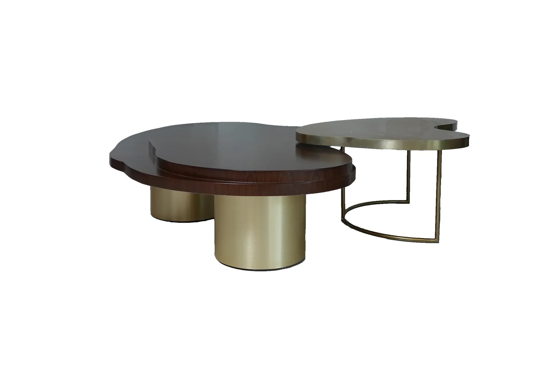 This captivating center table set comprises two freeform-shaped tables that overlap each other, creating a visually striking and harmonious composition. One table features a sunburst wooden pattern, radiating outwards from the center in a mesmerizing display of natural beauty. The intricate wood grain and warm tones of this table evoke a sense of warmth and coziness. The other table in the set boasts a subtle gold finish, adding a touch of elegance and sophistication to the overall design. The gold table's smooth, reflective surface contrasts beautifully with the organic texture of the wooden table, creating a dynamic interplay of light and shadow. The freeform shape of both tables allows for a fluid and seamless transition between them, enhancing the visual appeal of the set.
