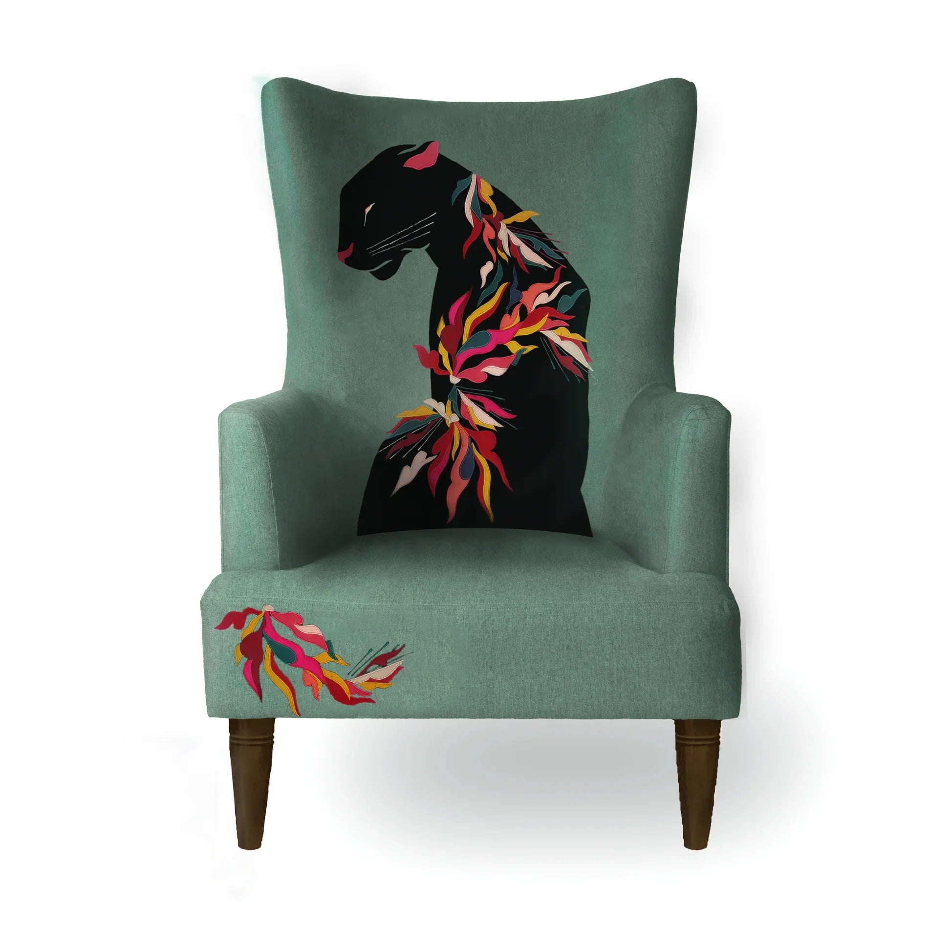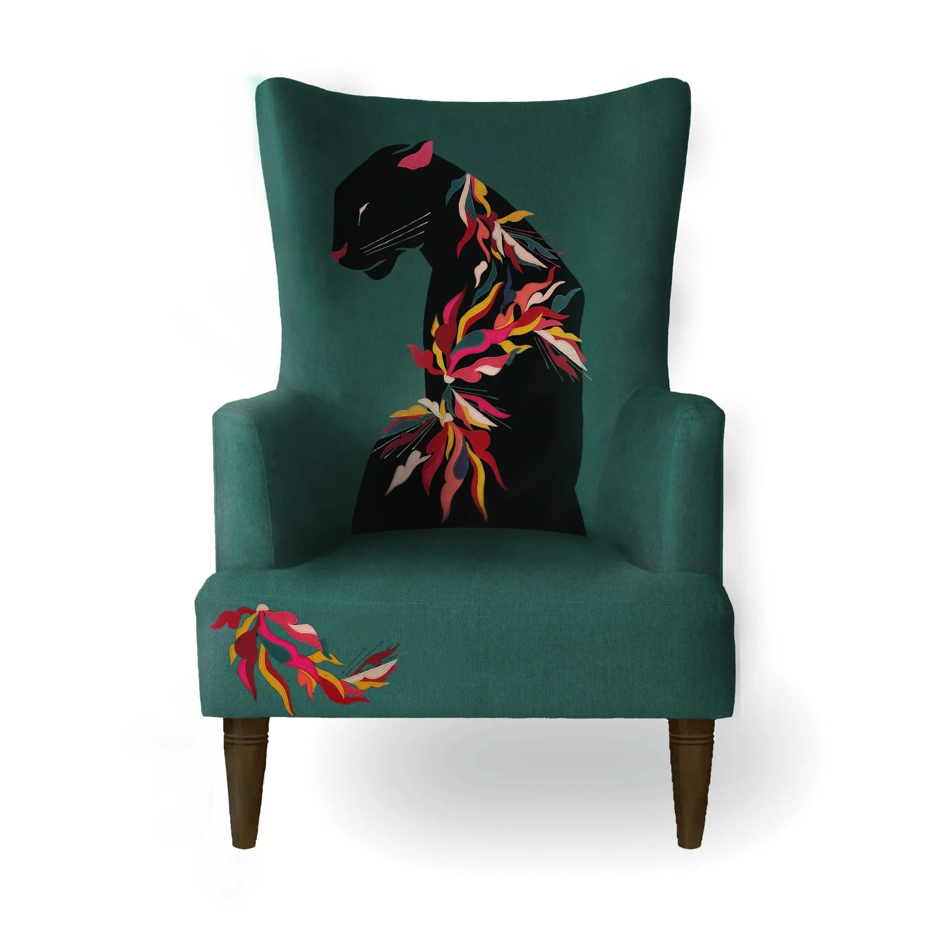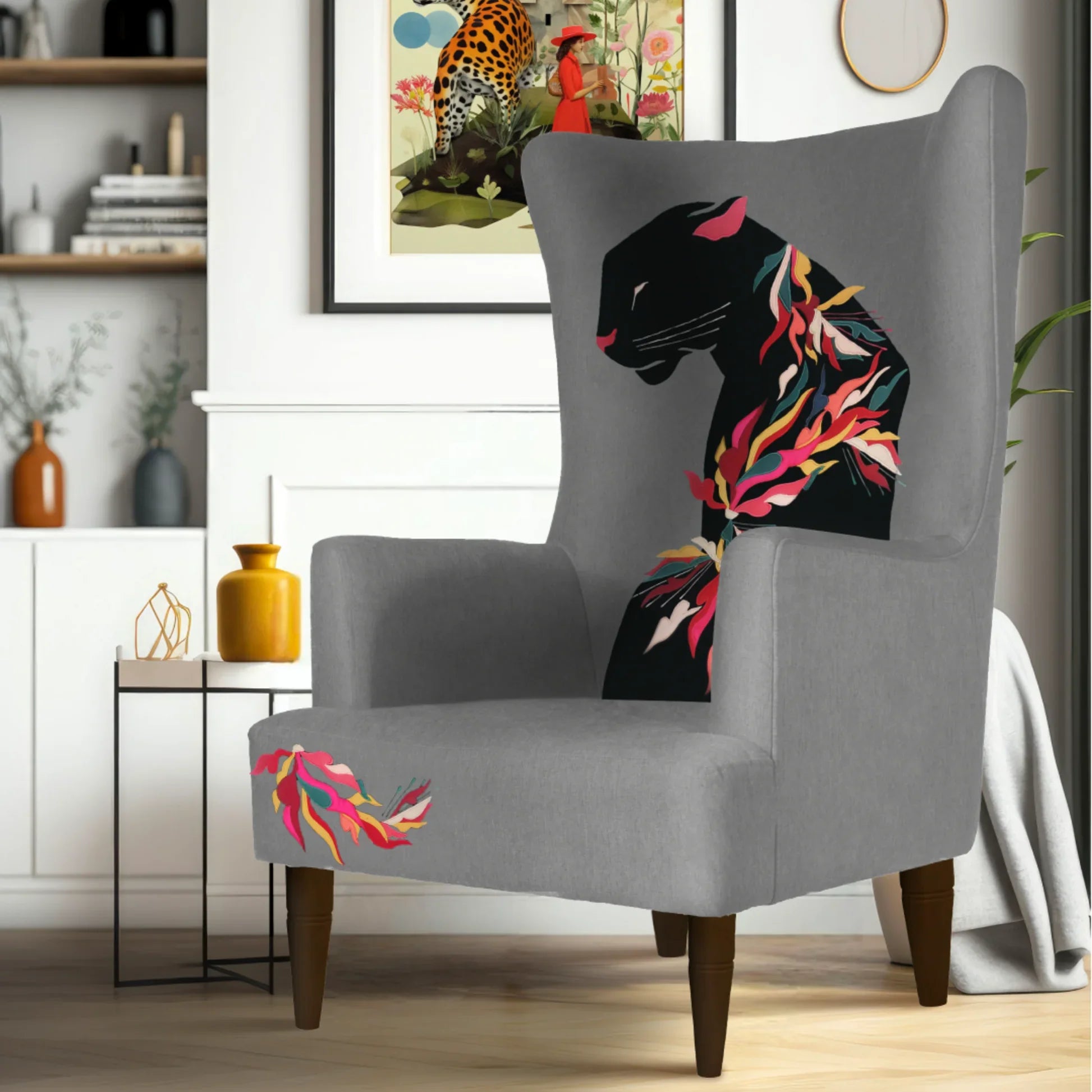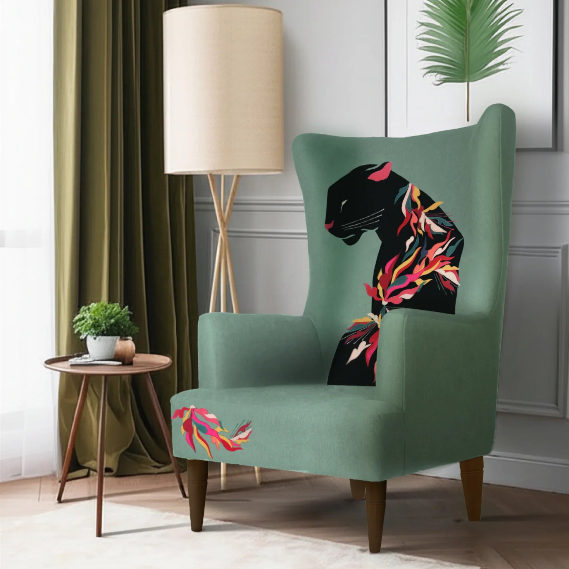 The Regal Roar wingback chair presents a magnificent high-back design, epitomizing sophistication and unparalleled comfort. This extraordinary furniture piece is distinguished by its exquisite panther motif, meticulously rendered through applique work on rich upholstery. Every detail, from the panther's piercing gaze to its majestic poise, is executed with exceptional artistry, establishing this chair as a true statement piece that commands attention.