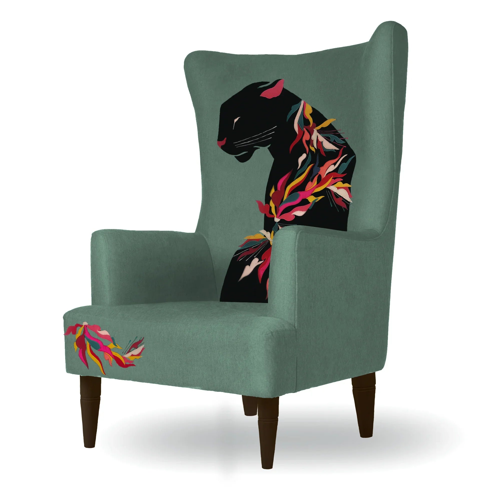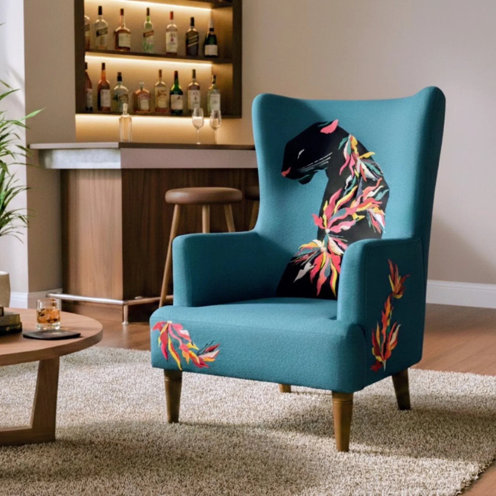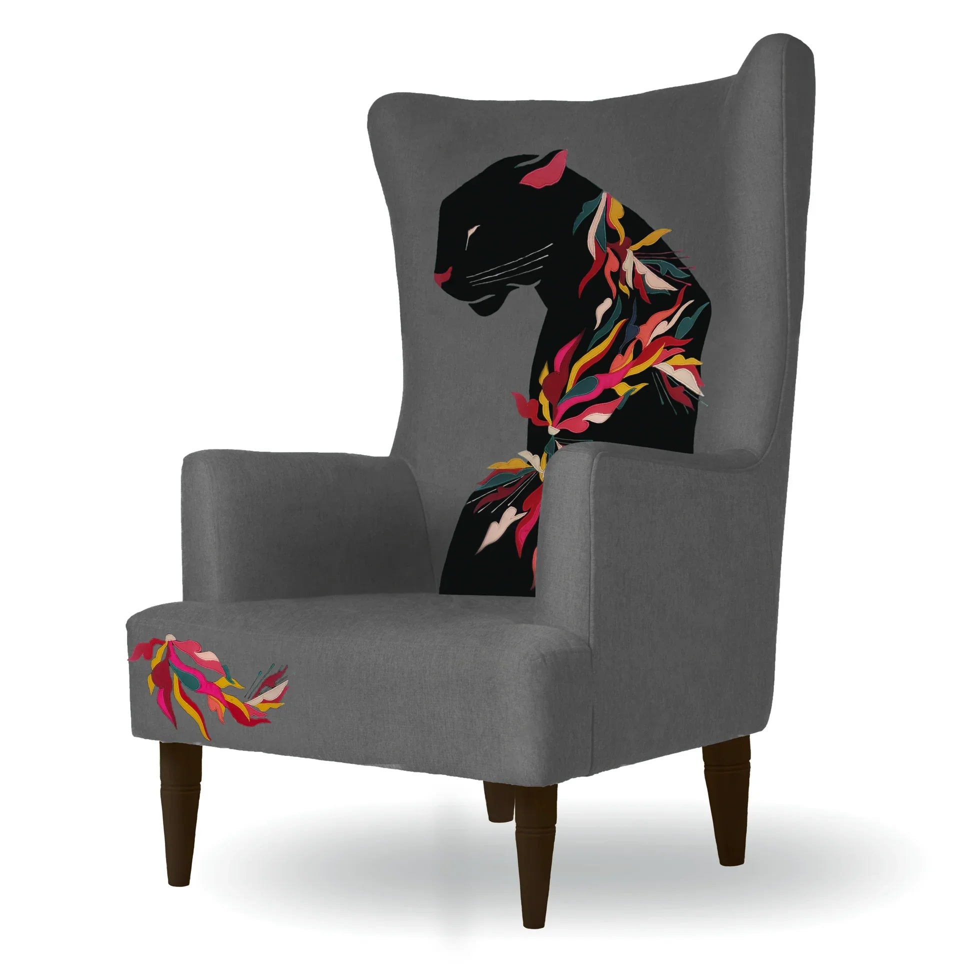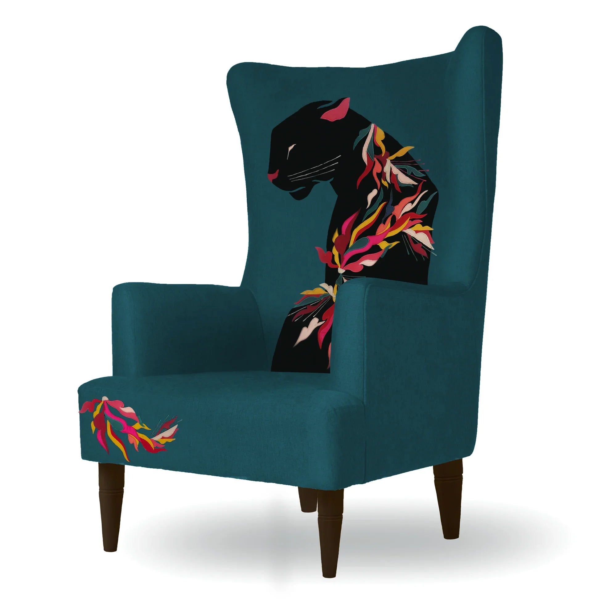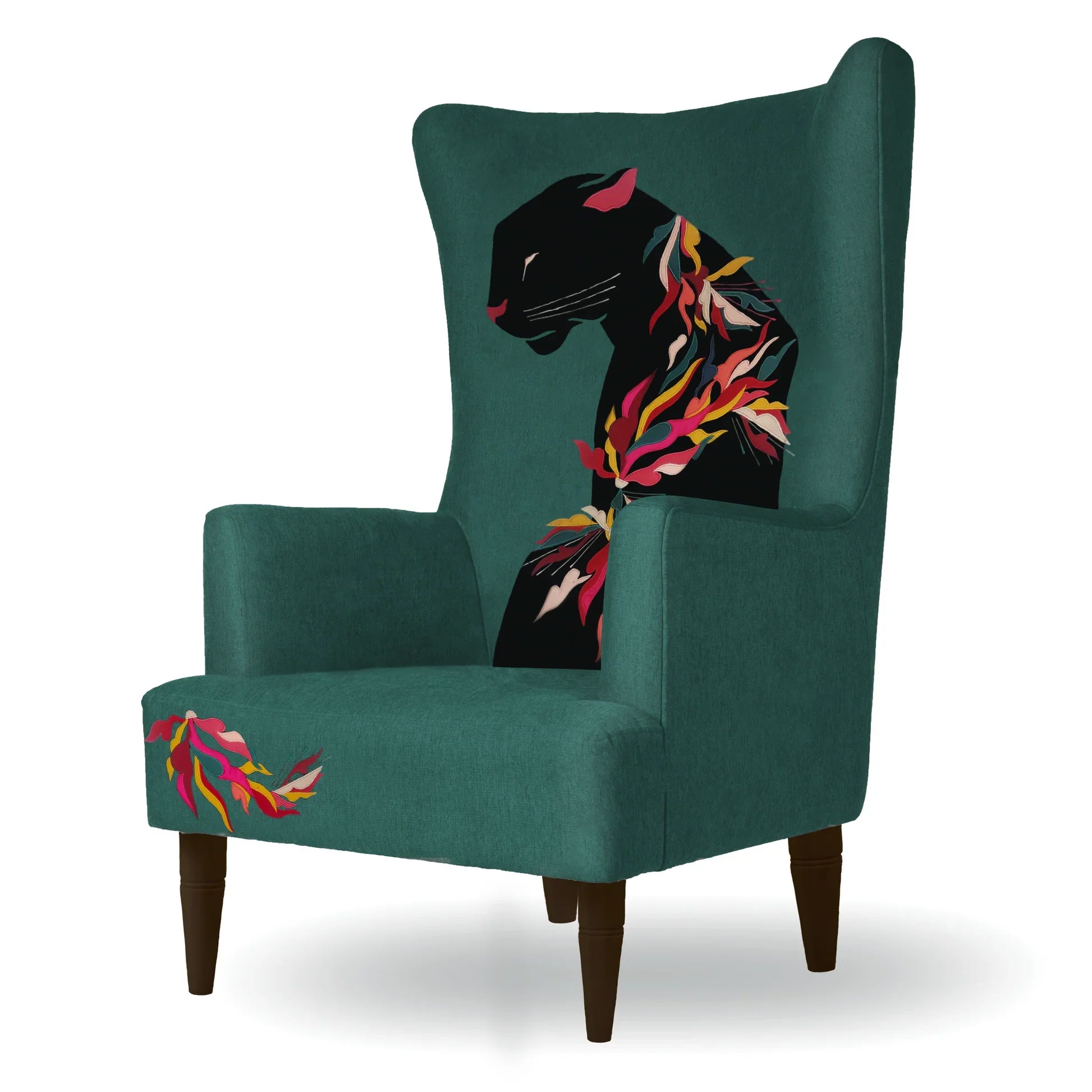 The Regal Roar wingback chair presents a magnificent high-back design, epitomizing sophistication and unparalleled comfort. This extraordinary furniture piece is distinguished by its exquisite panther motif, meticulously rendered through applique work on rich upholstery. Every detail, from the panther's piercing gaze to its majestic poise, is executed with exceptional artistry, establishing this chair as a true statement piece that commands attention.