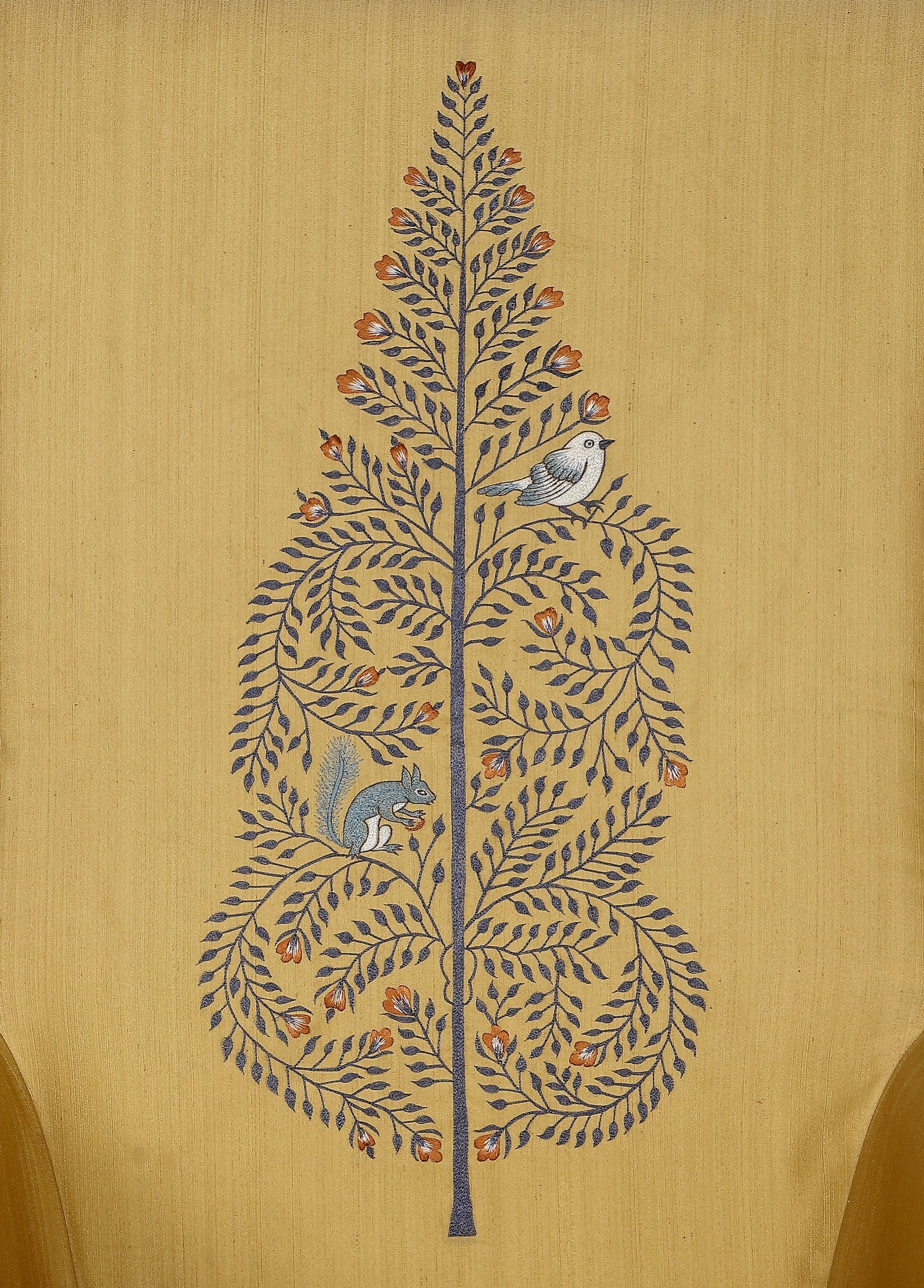 The Tree of Life Chair embodies the essence of sophistication, luxury, and the time-honored artistic traditions of India. Drawing inspiration from the auspicious Pattachitra folk art, this chair showcases intricate Tree of life with bird and squirrel embroidery adorned upon a vibrant silk fabric. Its profound shape, plush upholstery, and sturdy wood frame unite to create an unparalleled legend of comfort. The Tree of Life chair is the quintessential choice for those seeking to elevate their living space with a touch of elegance and auspiciousness.